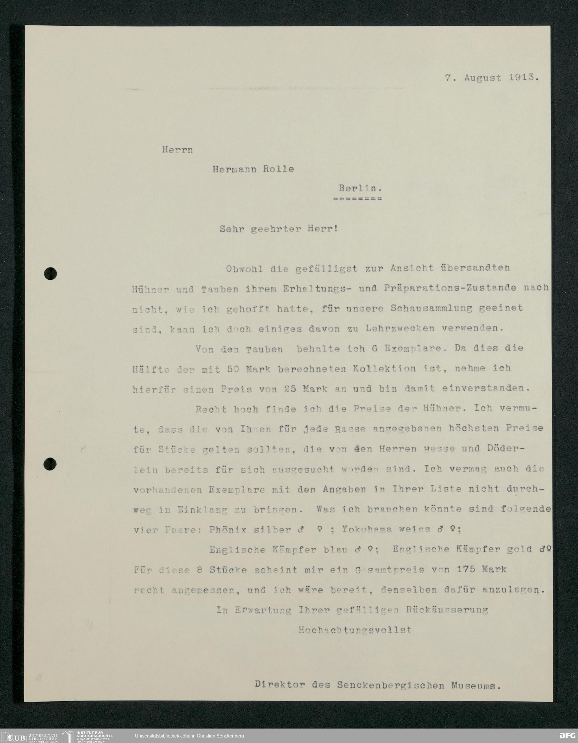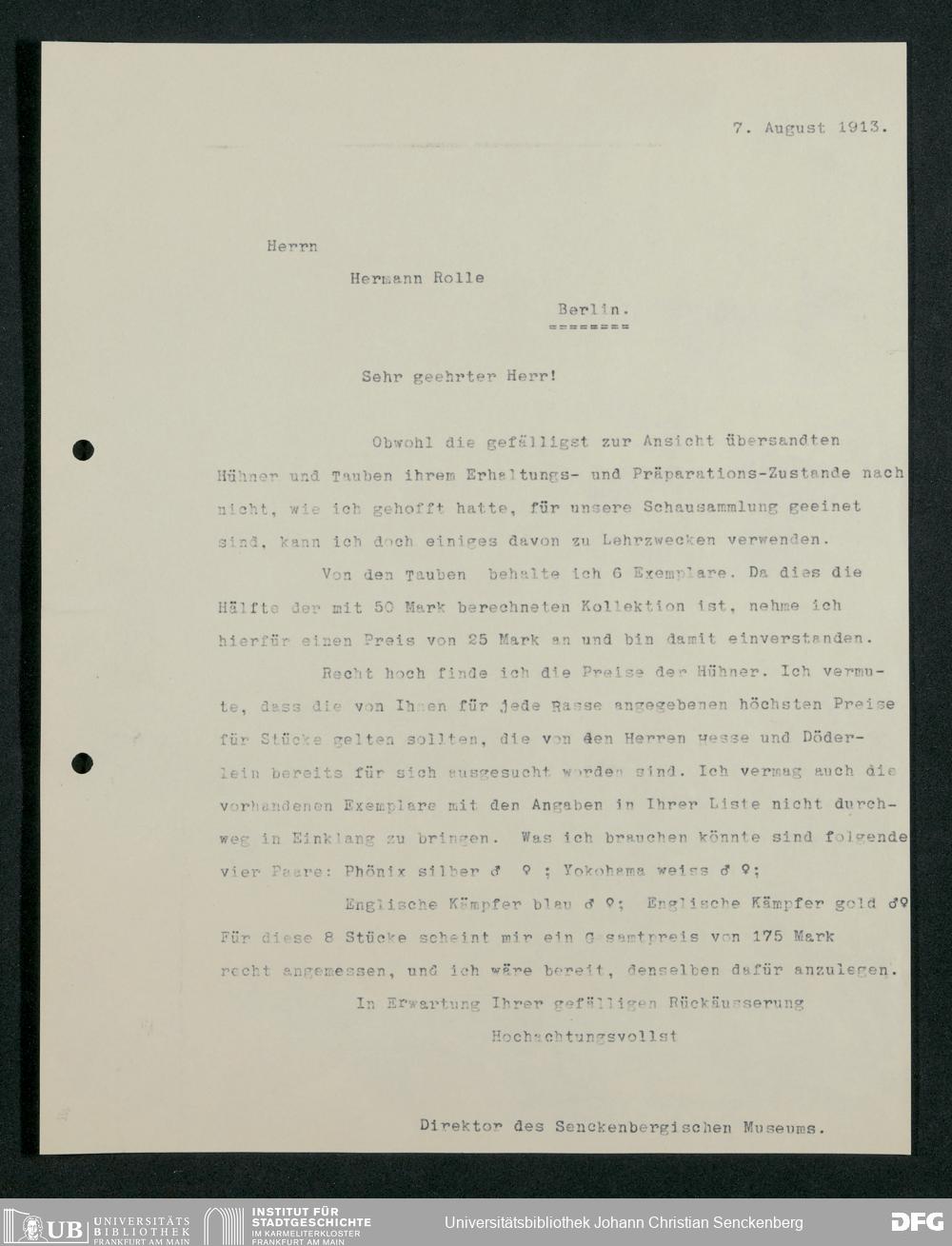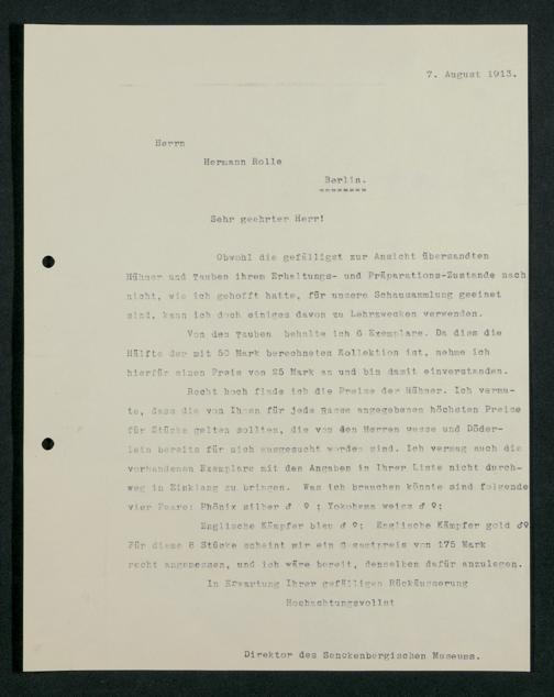 V176 Senckenberg Gesellschaft für Naturforschung, 210 - Erwerb zoologischer Exponate bei der Firma Kosmos Naturhistorisches und ethnographisches Institut Hermann Rolle