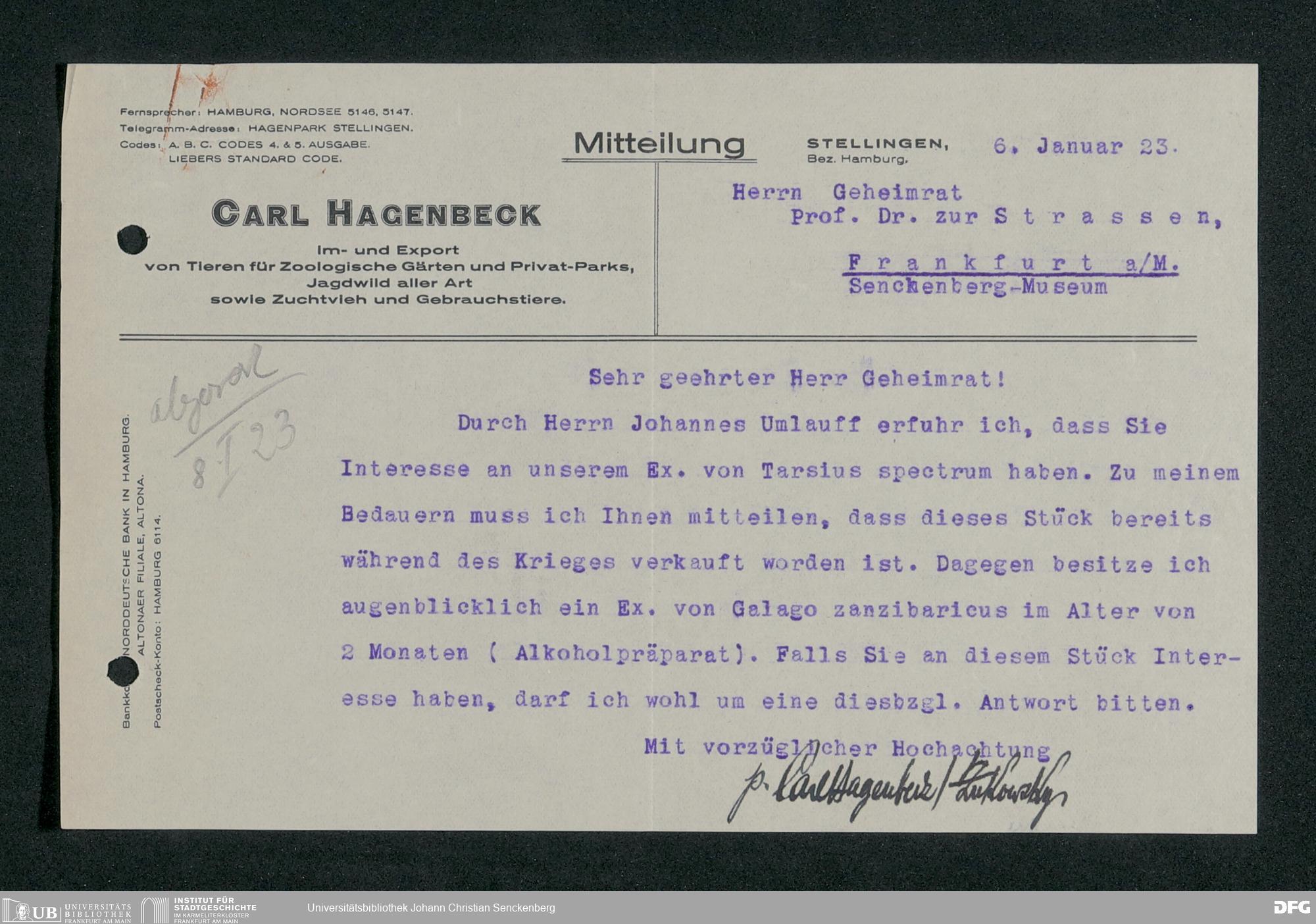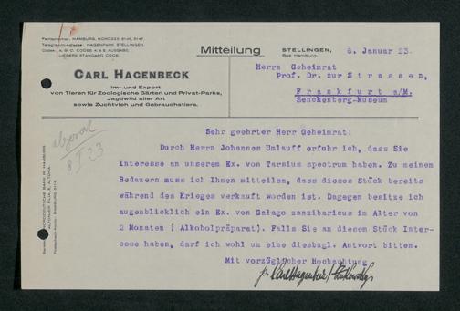 V176 Senckenberg Gesellschaft für Naturforschung, 197 - Ankauf von Exponaten bei Carl Hagenbeck