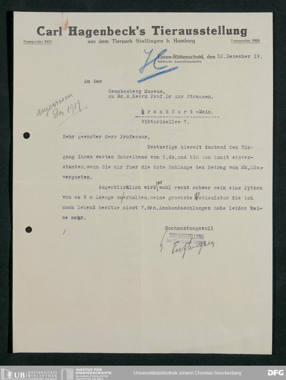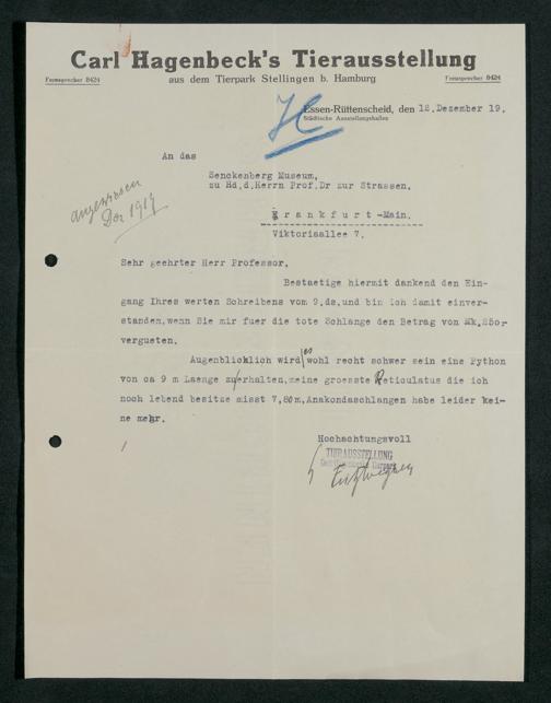 V176 Senckenberg Gesellschaft für Naturforschung, 197 - Ankauf von Exponaten bei Carl Hagenbeck