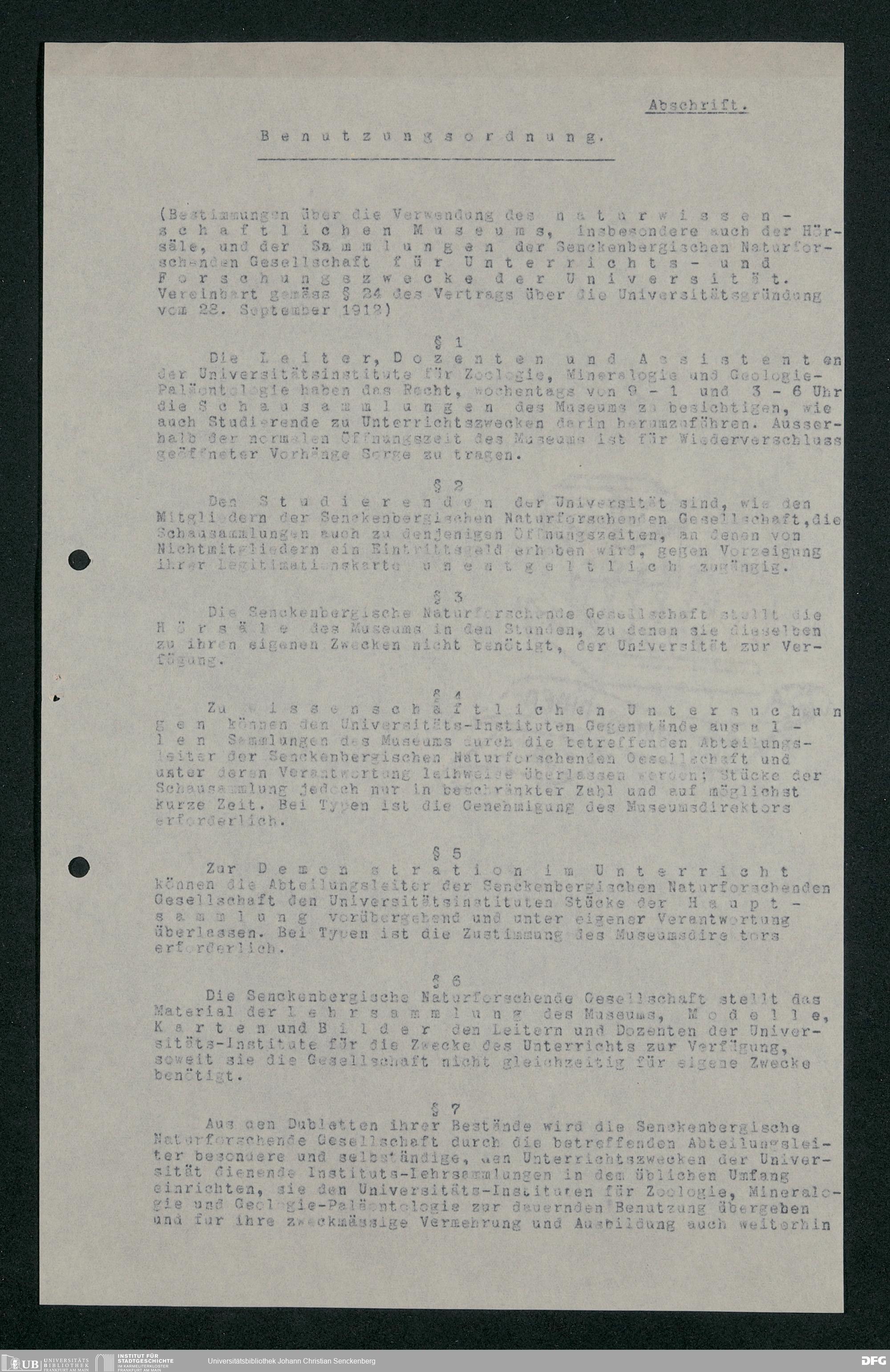 V176 Senckenberg Gesellschaft für Naturforschung, 255 - Benutzungsordnung für die Nutzung der Einrichtungen der Senckenbergischen Naturforschenden Gesellschaft durch die Universität