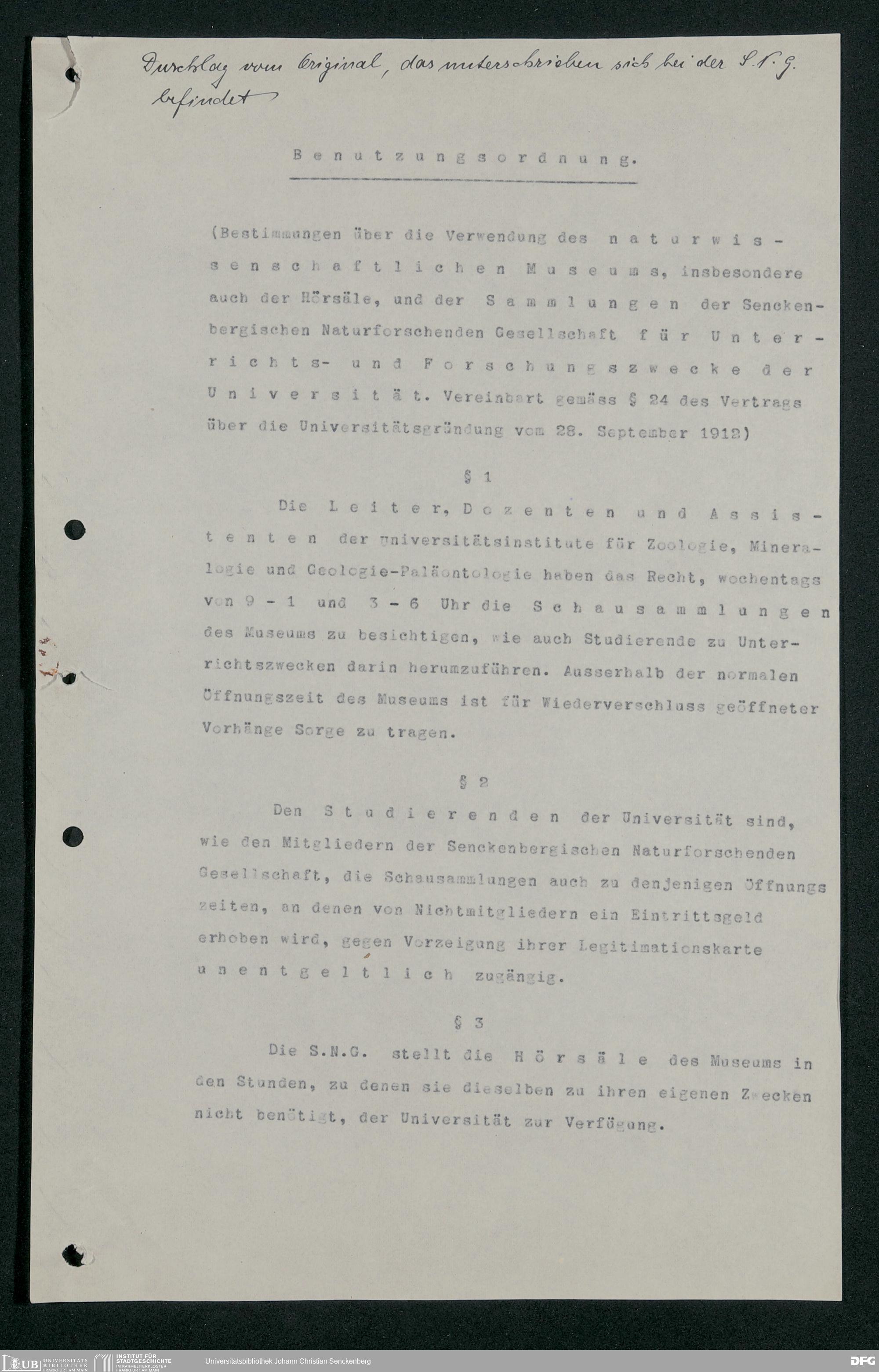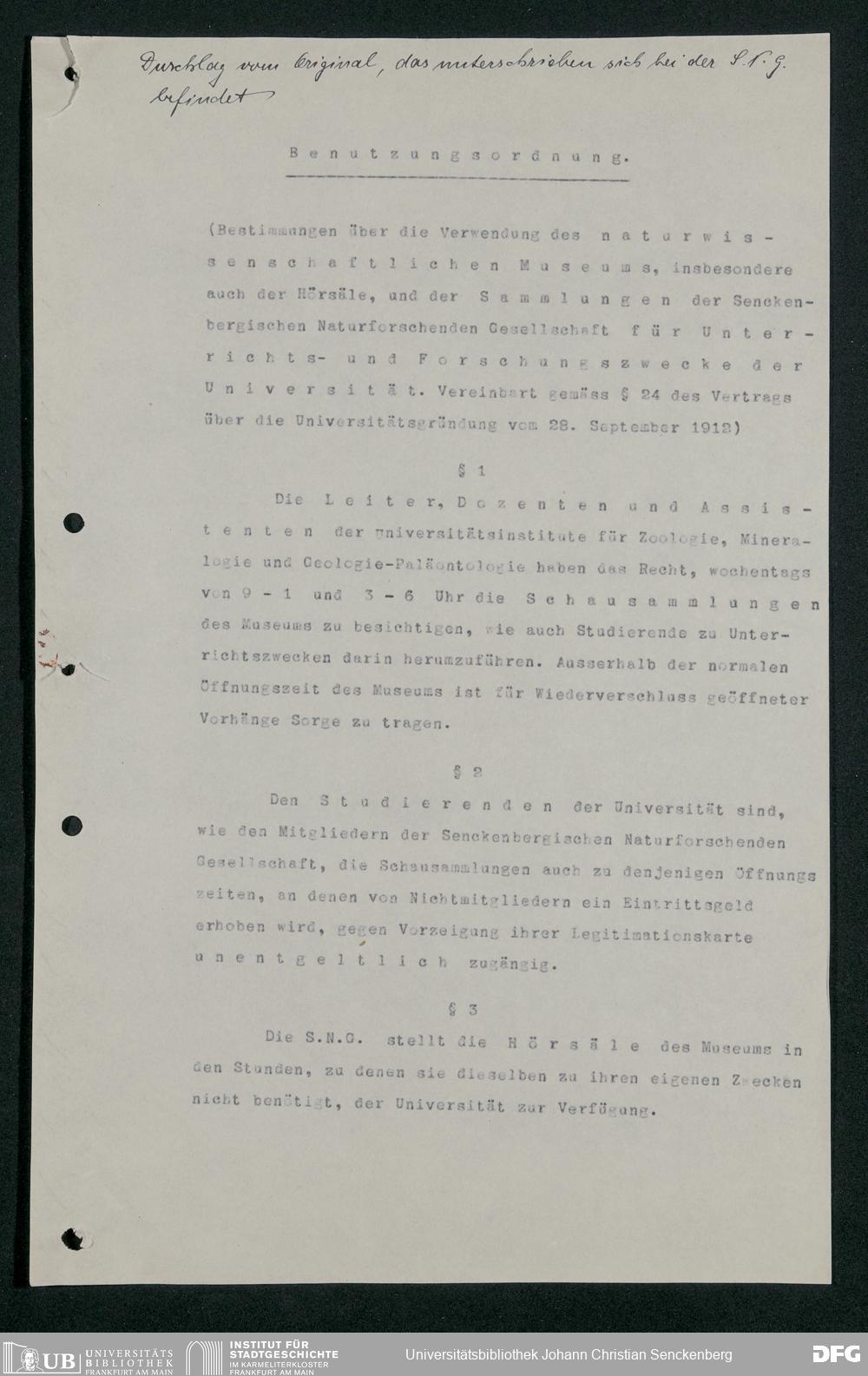 V176 Senckenberg Gesellschaft für Naturforschung, 255 - Benutzungsordnung für die Nutzung der Einrichtungen der Senckenbergischen Naturforschenden Gesellschaft durch die Universität