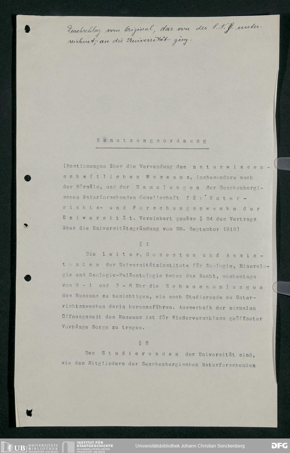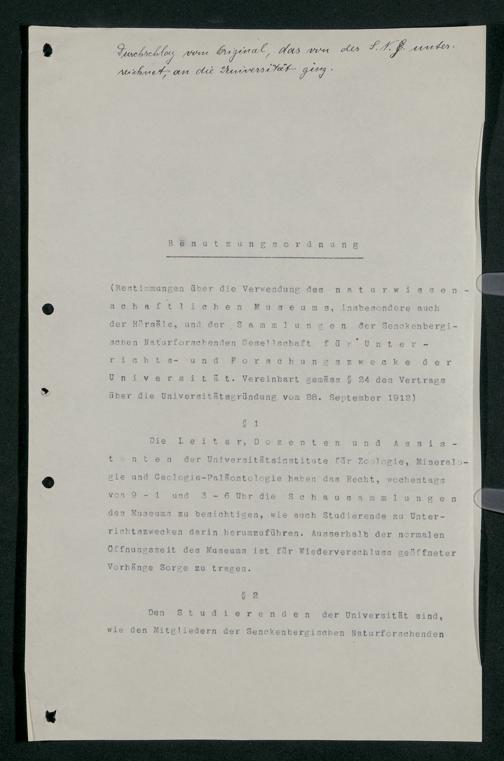 V176 Senckenberg Gesellschaft für Naturforschung, 255 - Benutzungsordnung für die Nutzung der Einrichtungen der Senckenbergischen Naturforschenden Gesellschaft durch die Universität