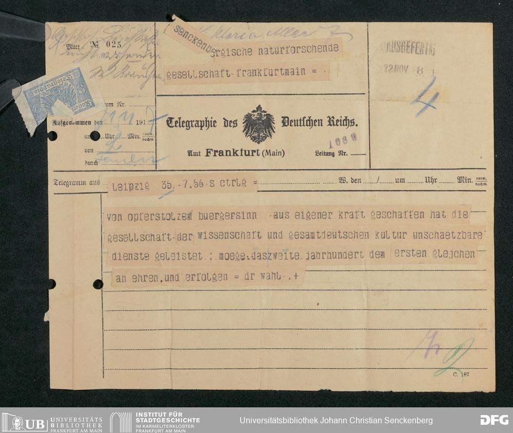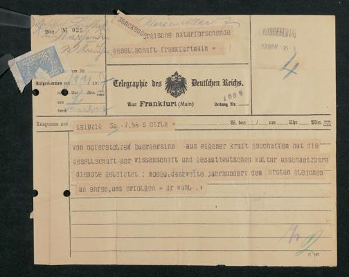 V176 Senckenberg Gesellschaft für Naturforschung, 306 - Eingegangene Gratulationsschreiben anlässlich der Jahrhundertfeier