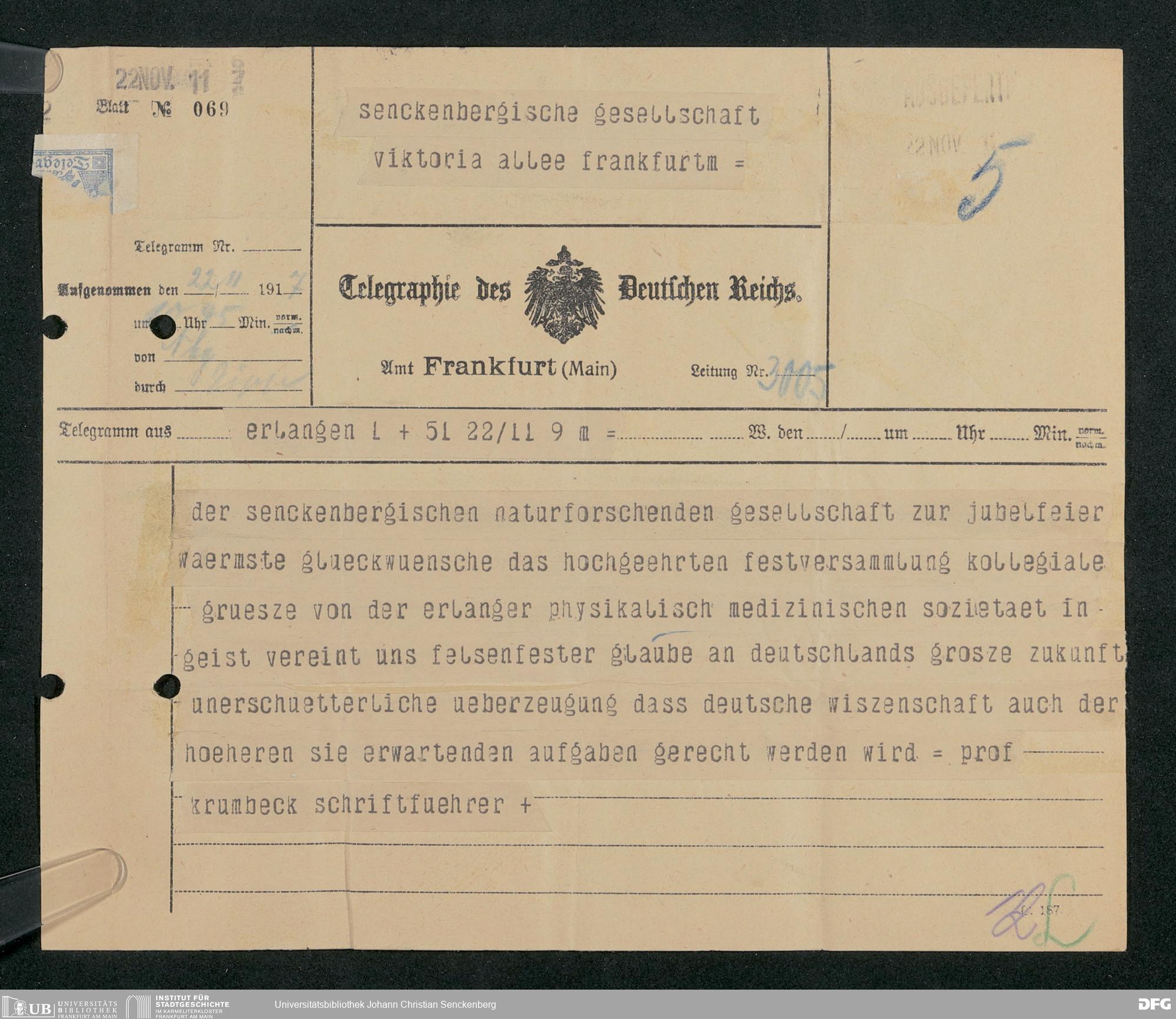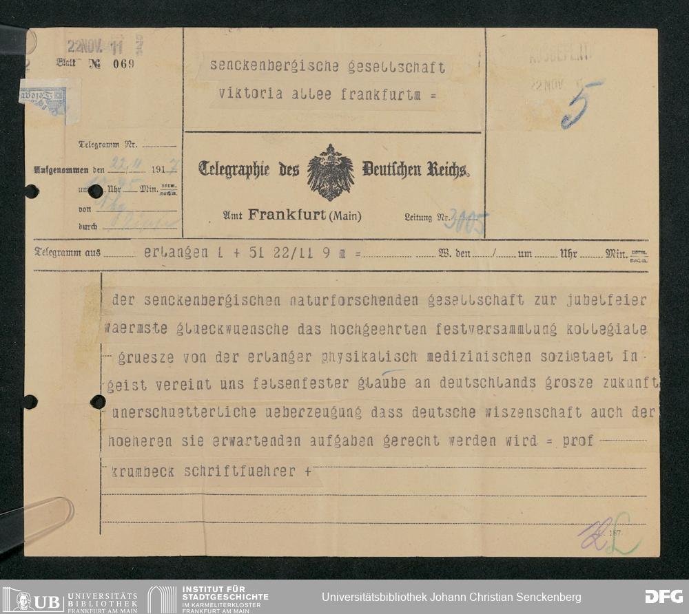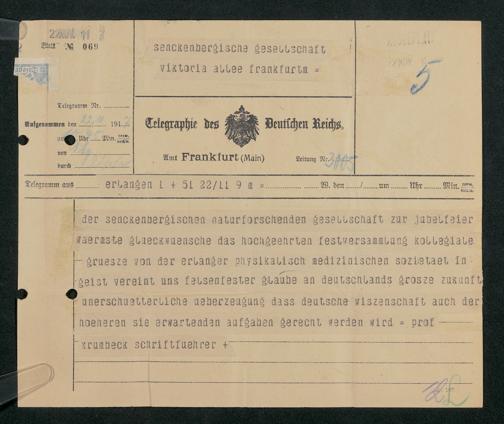 V176 Senckenberg Gesellschaft für Naturforschung, 306 - Eingegangene Gratulationsschreiben anlässlich der Jahrhundertfeier