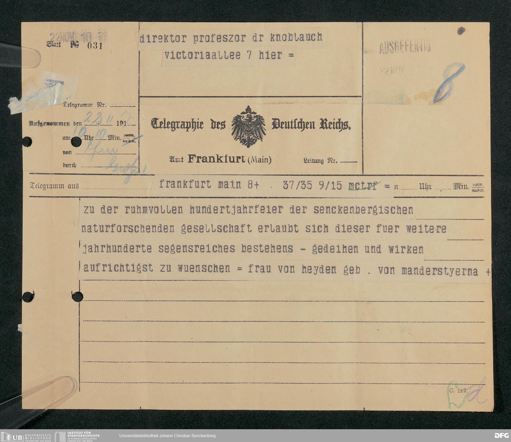 V176 Senckenberg Gesellschaft für Naturforschung, 306 - Eingegangene Gratulationsschreiben anlässlich der Jahrhundertfeier