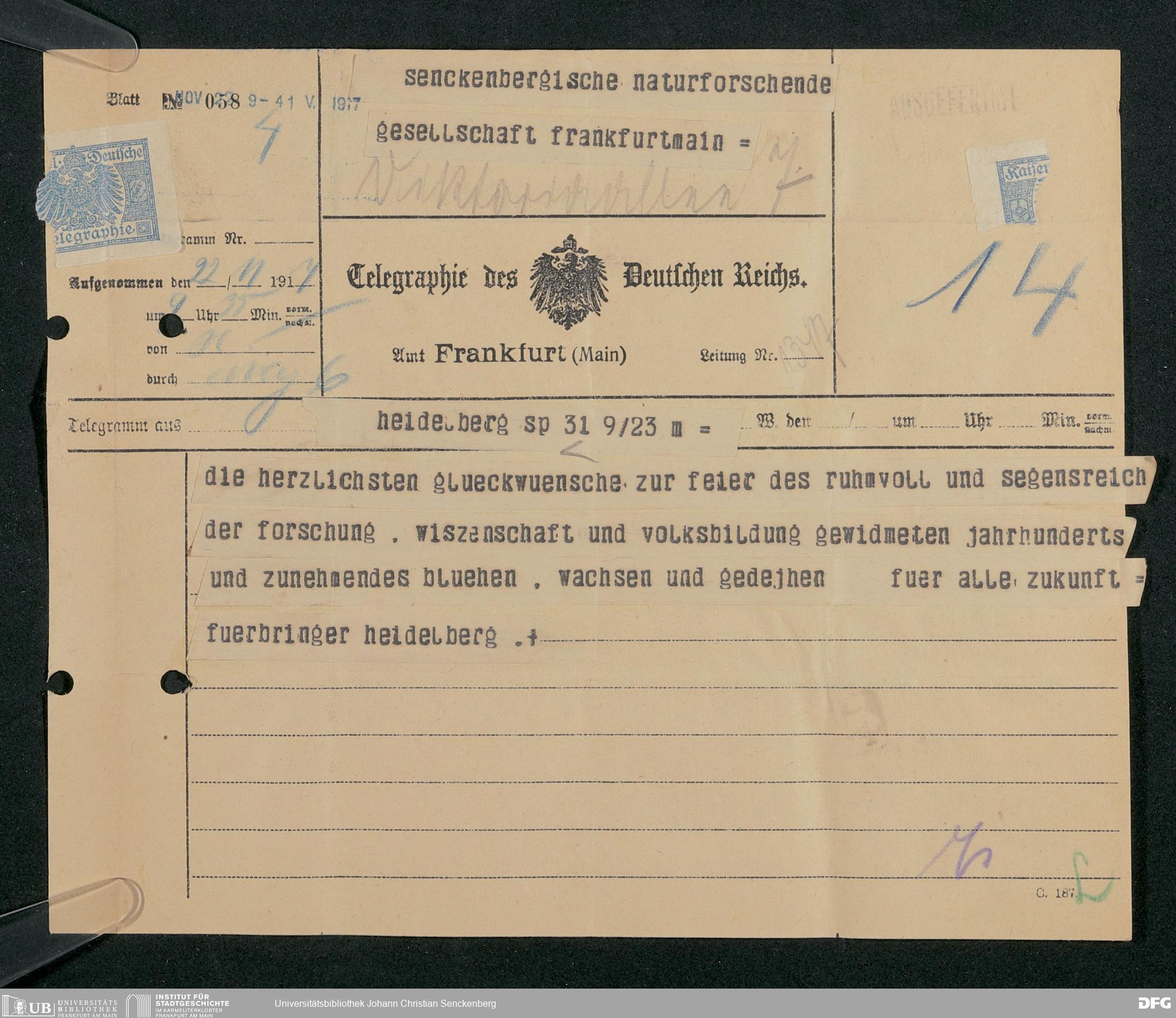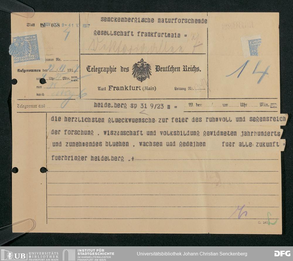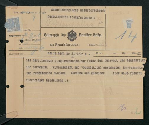 V176 Senckenberg Gesellschaft für Naturforschung, 306 - Eingegangene Gratulationsschreiben anlässlich der Jahrhundertfeier