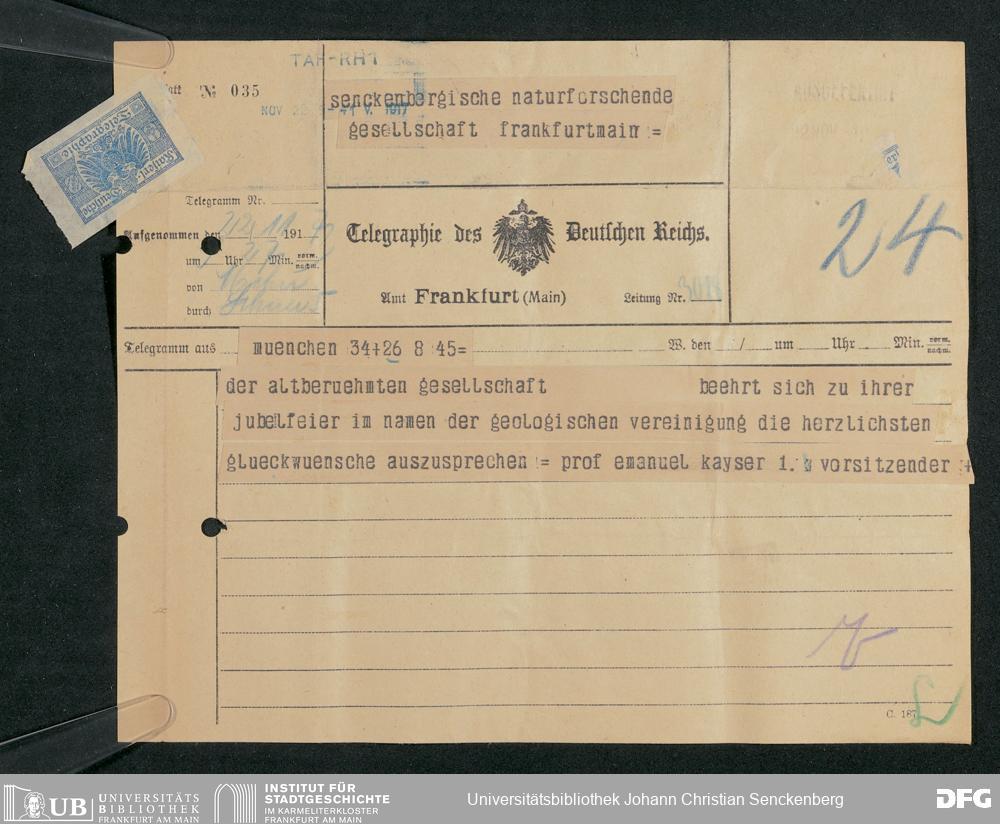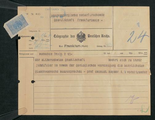 V176 Senckenberg Gesellschaft für Naturforschung, 306 - Eingegangene Gratulationsschreiben anlässlich der Jahrhundertfeier