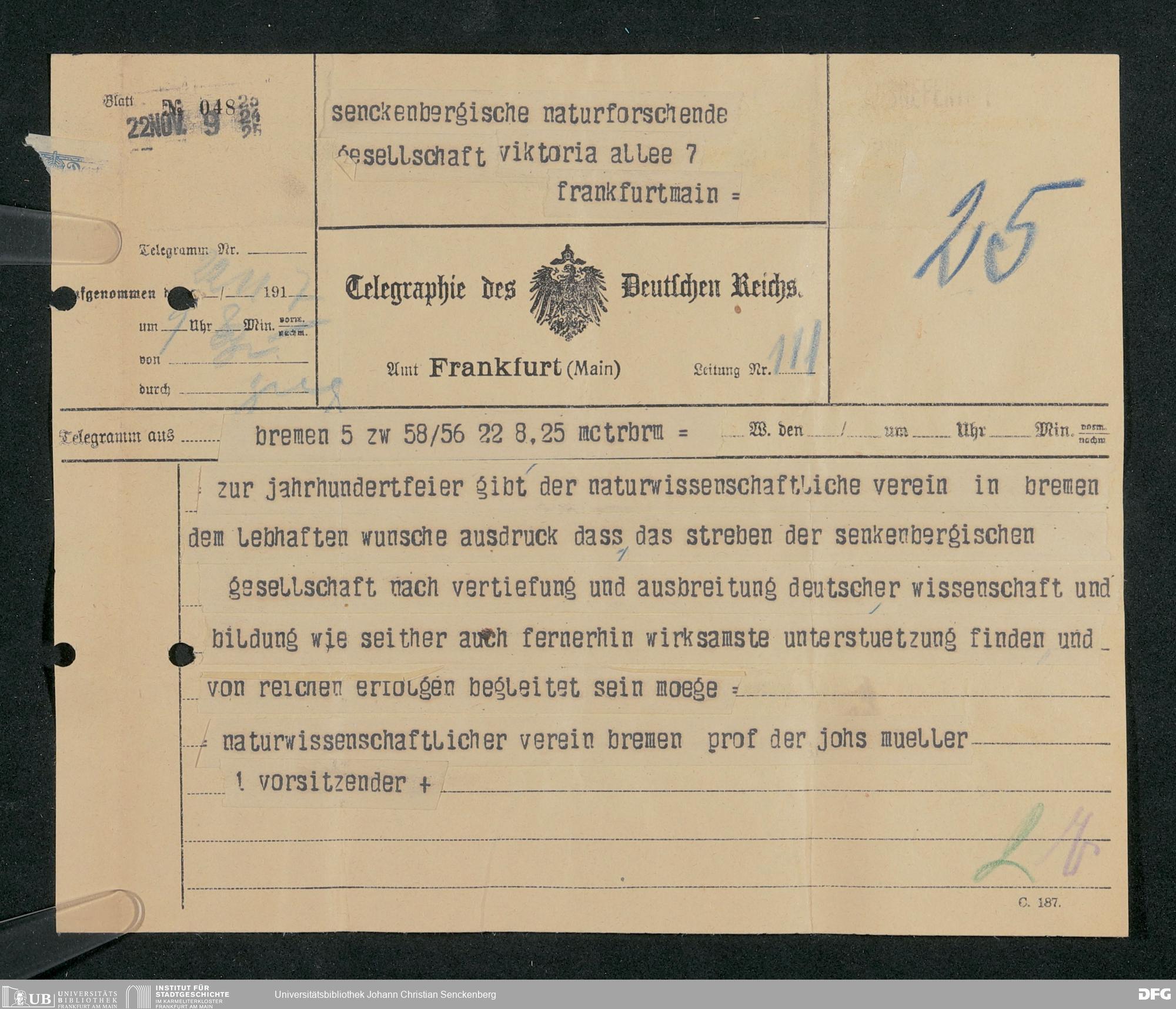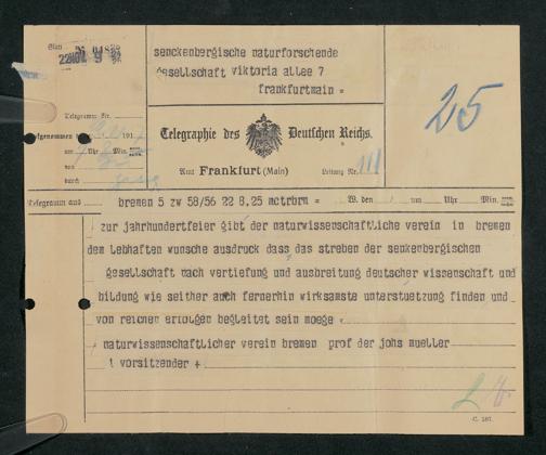 V176 Senckenberg Gesellschaft für Naturforschung, 306 - Eingegangene Gratulationsschreiben anlässlich der Jahrhundertfeier