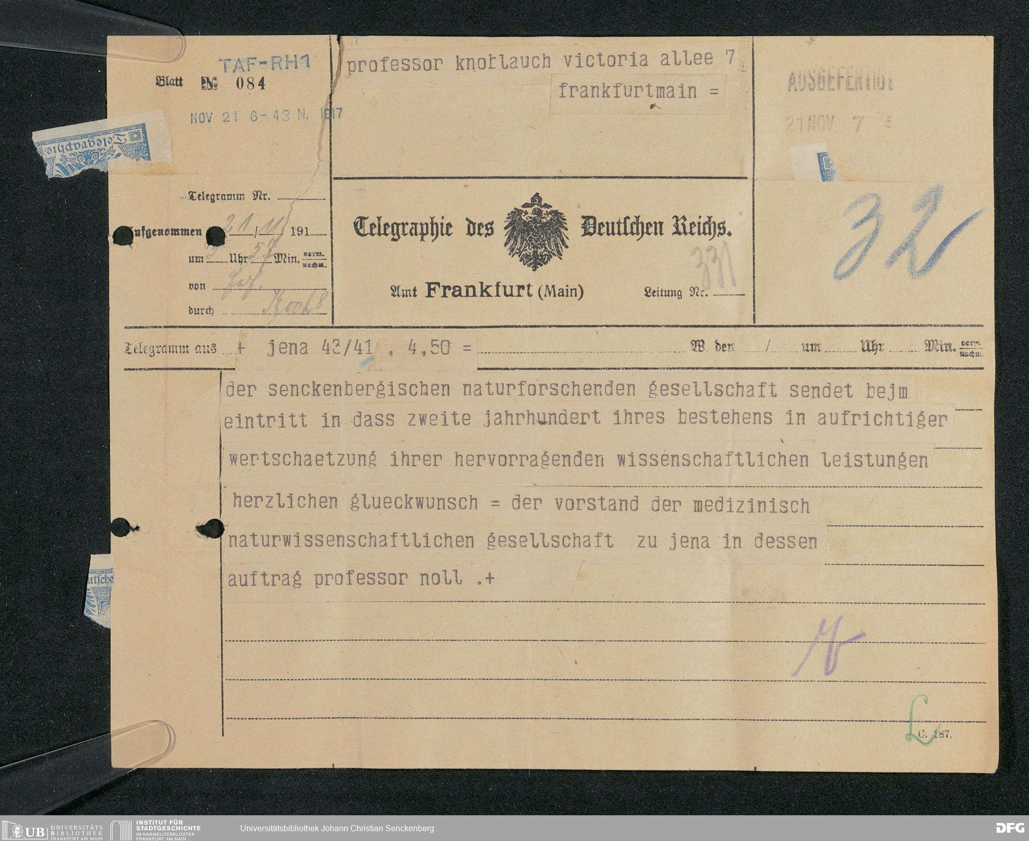 V176 Senckenberg Gesellschaft für Naturforschung, 306 - Eingegangene Gratulationsschreiben anlässlich der Jahrhundertfeier