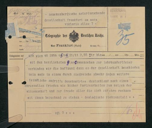V176 Senckenberg Gesellschaft für Naturforschung, 306 - Eingegangene Gratulationsschreiben anlässlich der Jahrhundertfeier