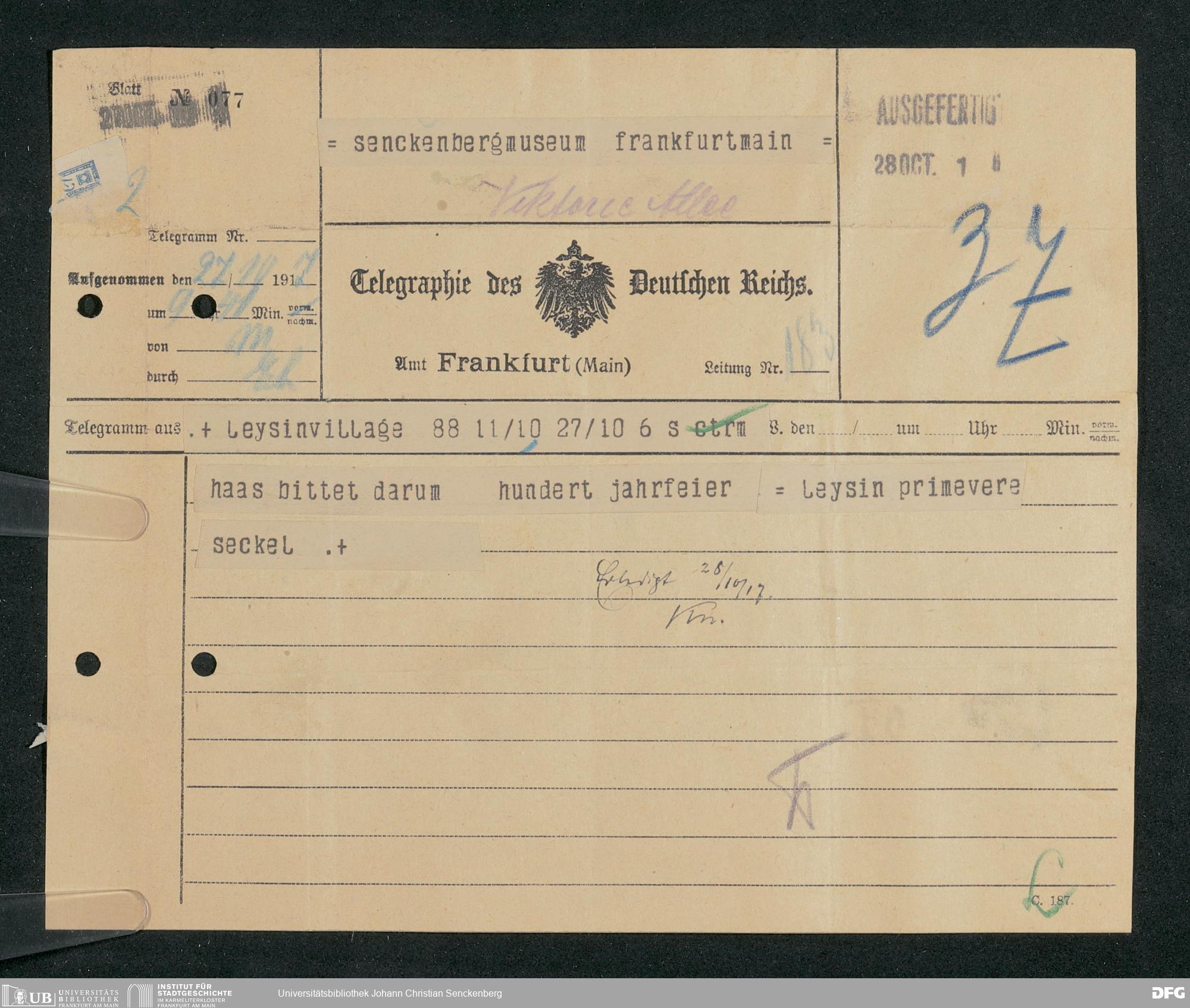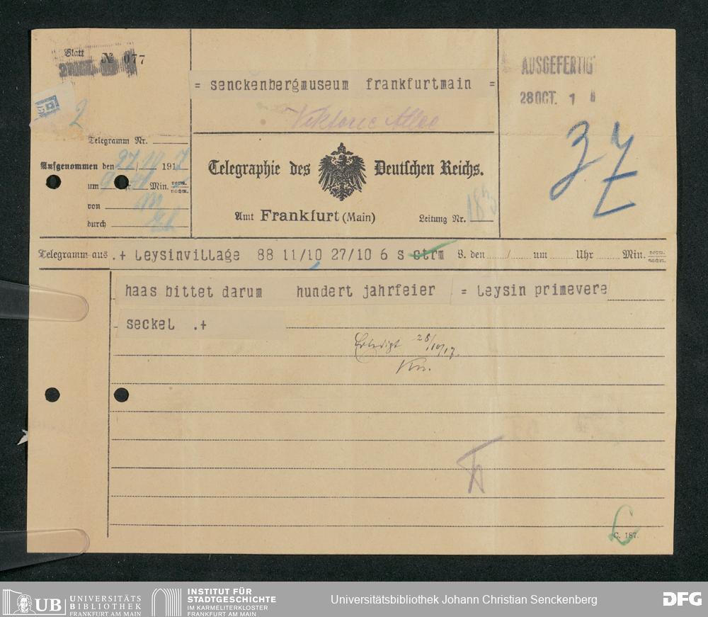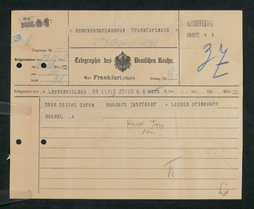 V176 Senckenberg Gesellschaft für Naturforschung, 306 - Eingegangene Gratulationsschreiben anlässlich der Jahrhundertfeier