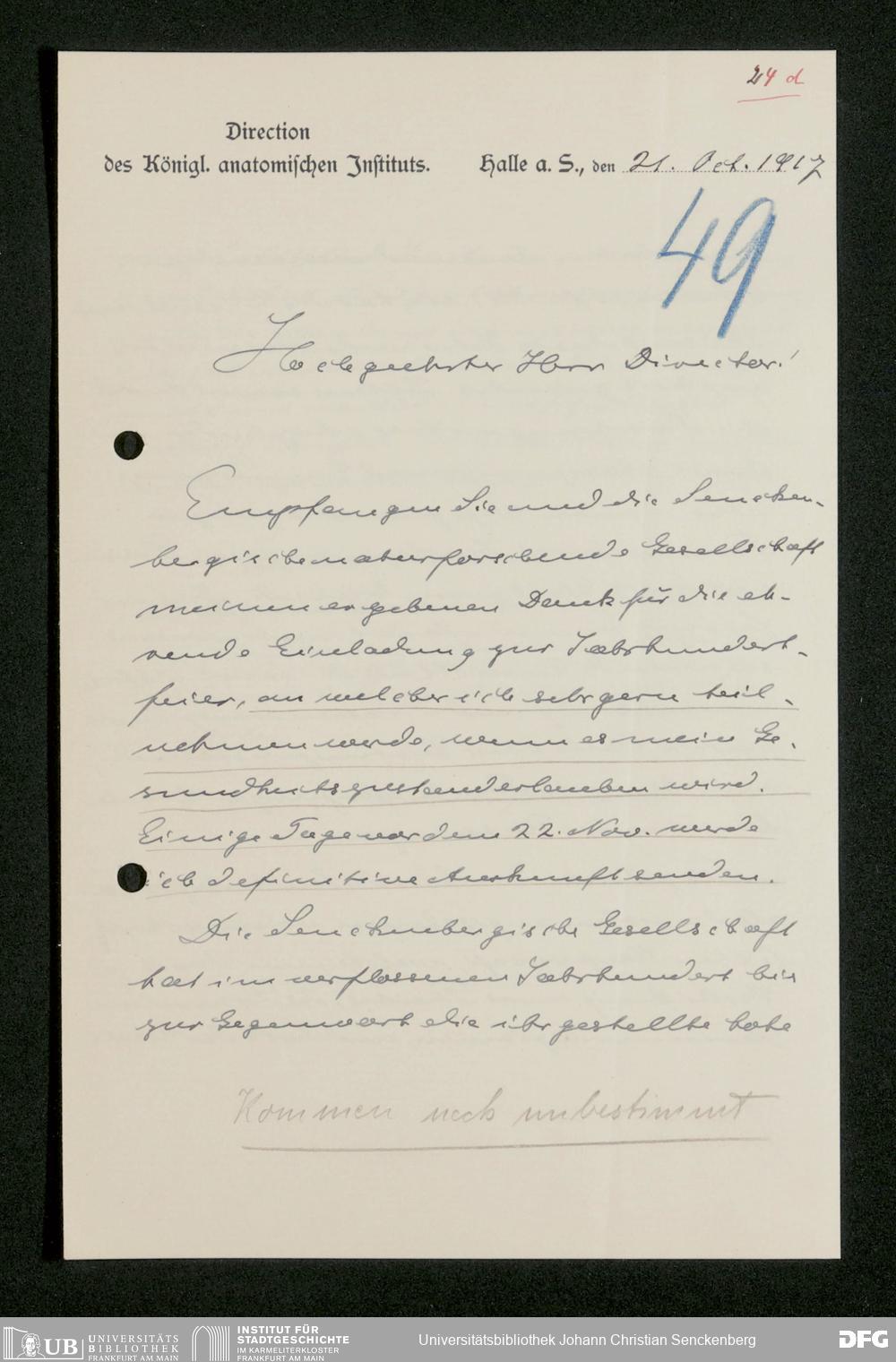 V176 Senckenberg Gesellschaft für Naturforschung, 306 - Eingegangene Gratulationsschreiben anlässlich der Jahrhundertfeier