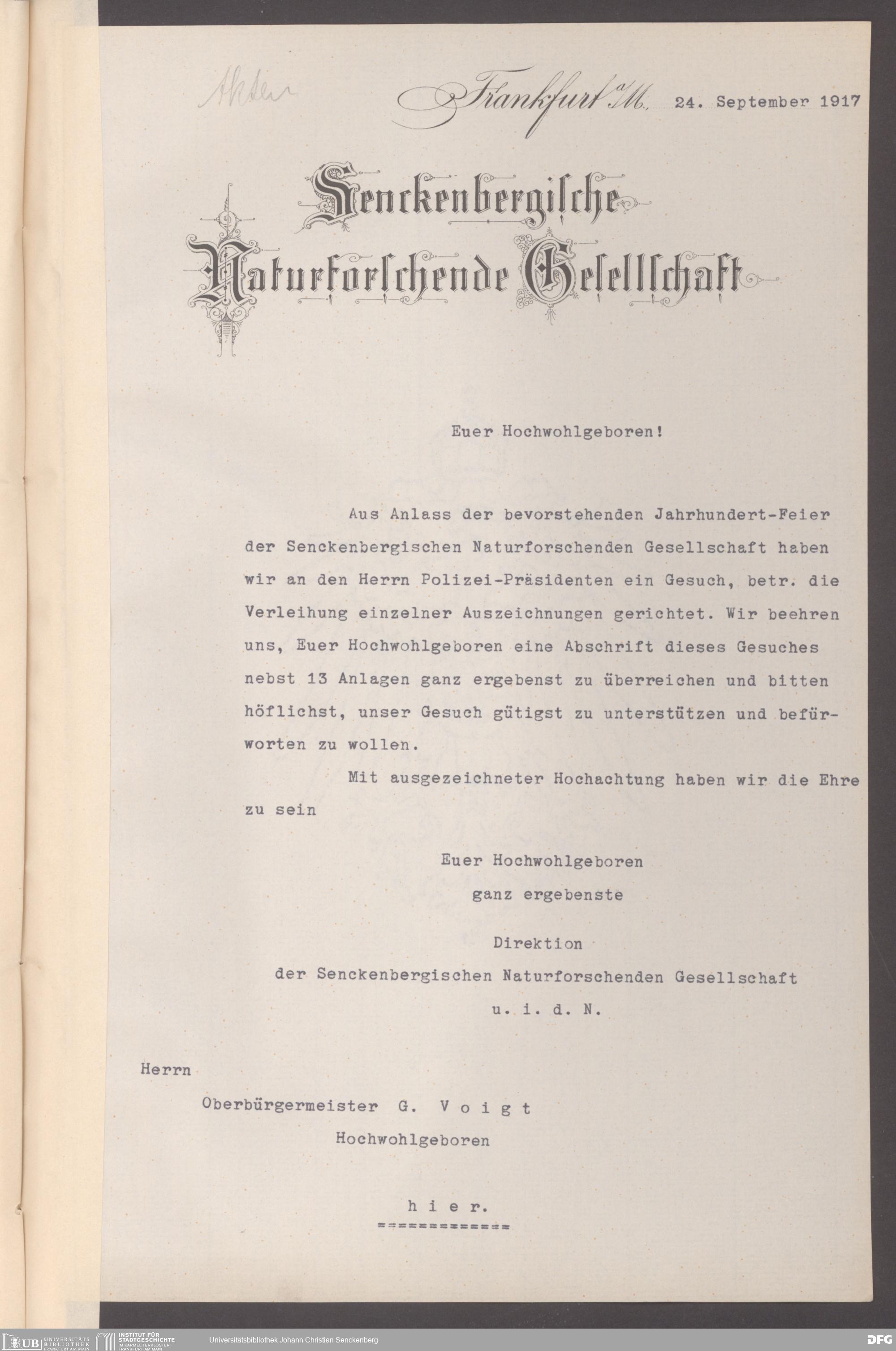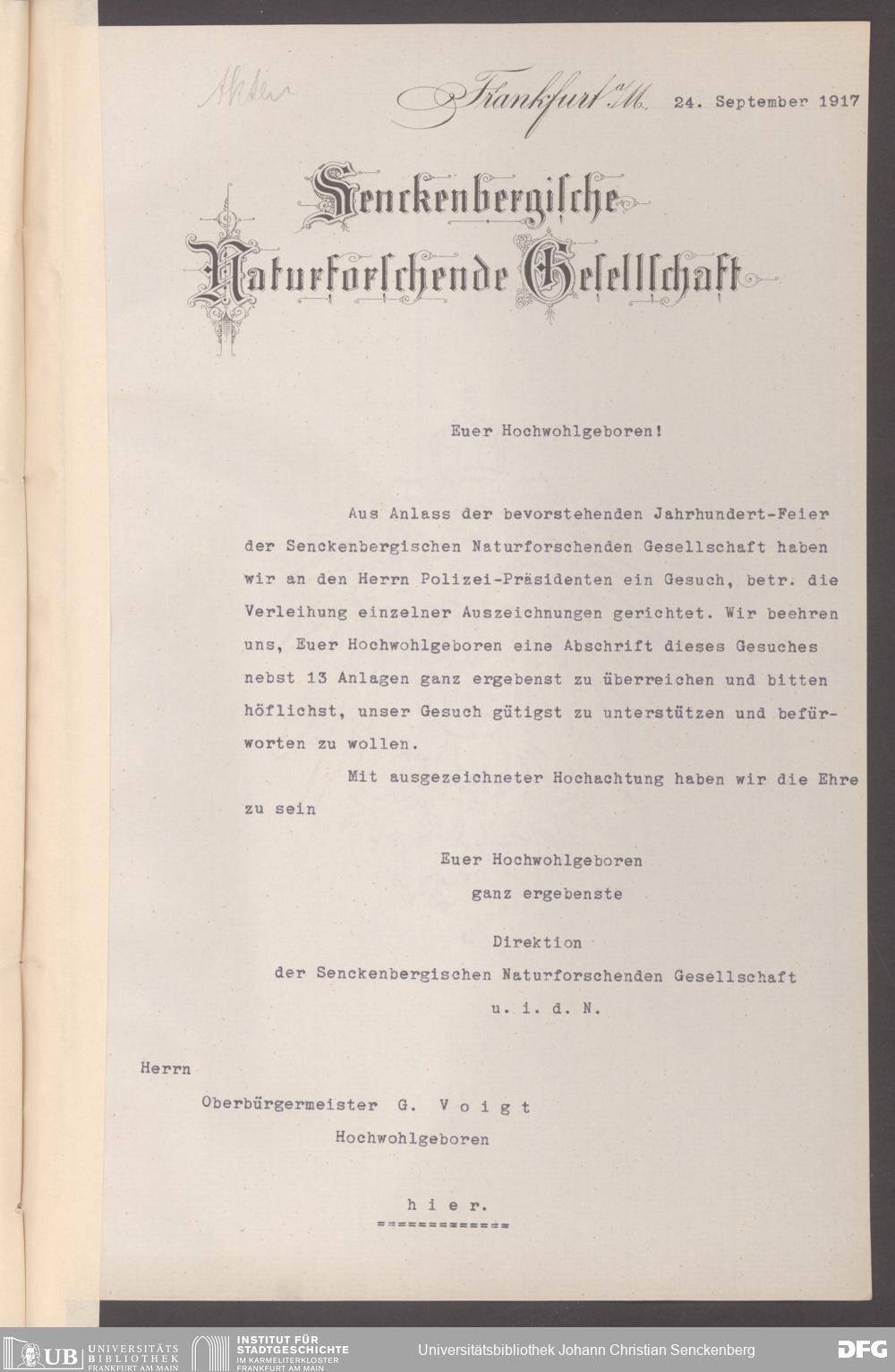 V176 Senckenberg Gesellschaft für Naturforschung, 326 - Bemühungen der Senckenbergischen Naturforschenden Gesellschaft um die Verleihung staatlicher Ehrentitel und Orden an verdiente Mitarbeiter und Förderer
