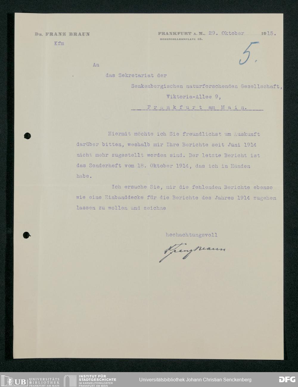 V176 Senckenberg Gesellschaft für Naturforschung, 342 - Tätigkeit der Redaktionskommission für den "Bericht der Senckenbergischen Naturforschenden Gesellschaft in Frankfurt am Main", Bd. 5