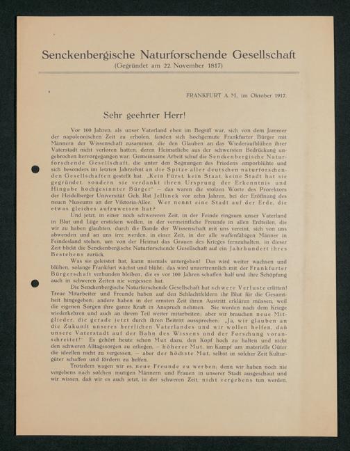 V176 Senckenberg Gesellschaft für Naturforschung, 371 - Dankschreiben für die anlässlich der Jahrhundertfeier von der Senckenbergischen Naturforschenden Gesellschaft vorgenommenen Ehrungen
