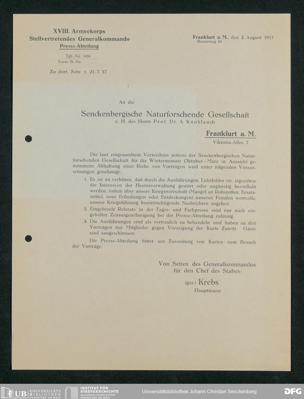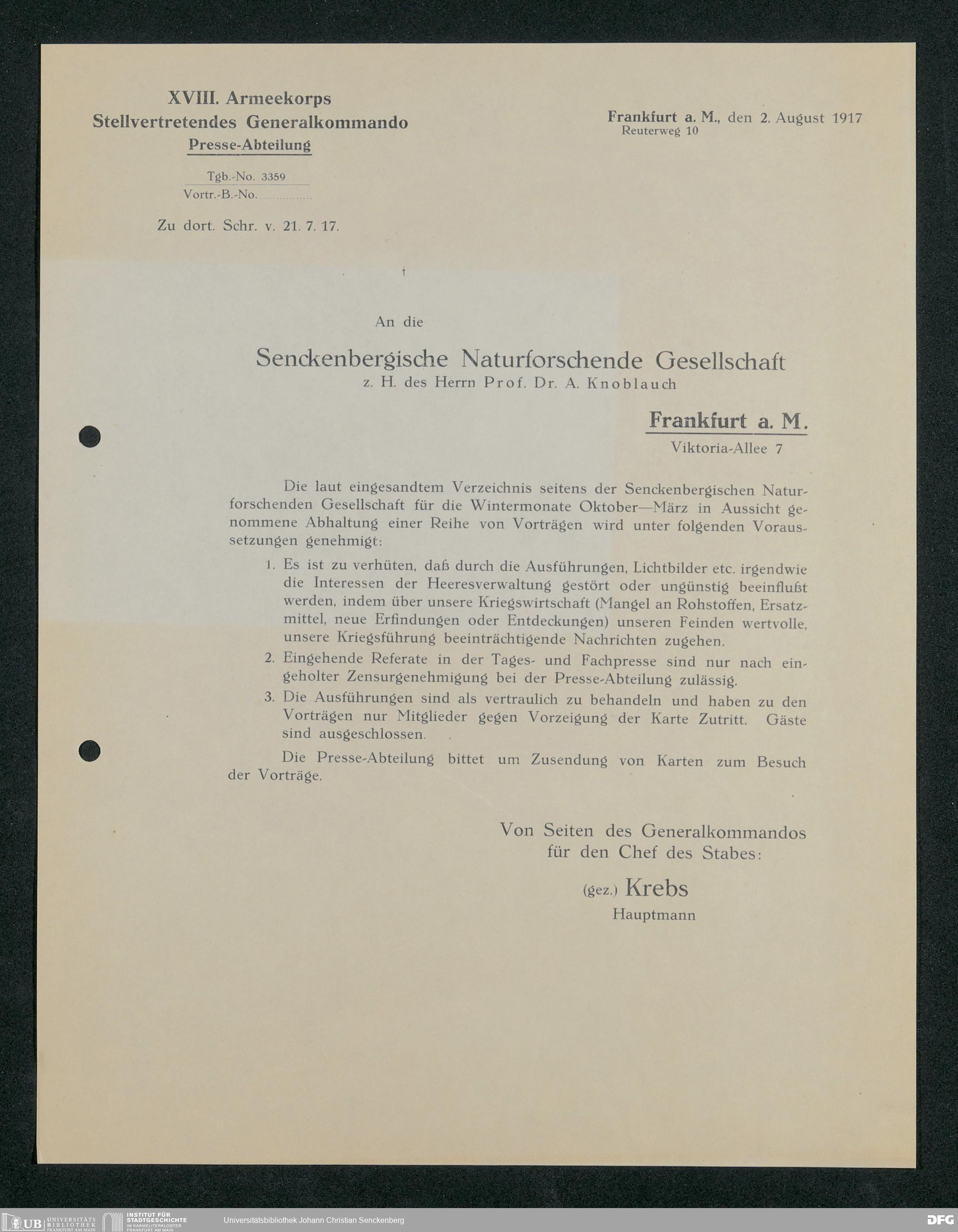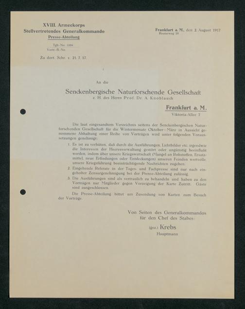 V176 Senckenberg Gesellschaft für Naturforschung, 371 - Dankschreiben für die anlässlich der Jahrhundertfeier von der Senckenbergischen Naturforschenden Gesellschaft vorgenommenen Ehrungen
