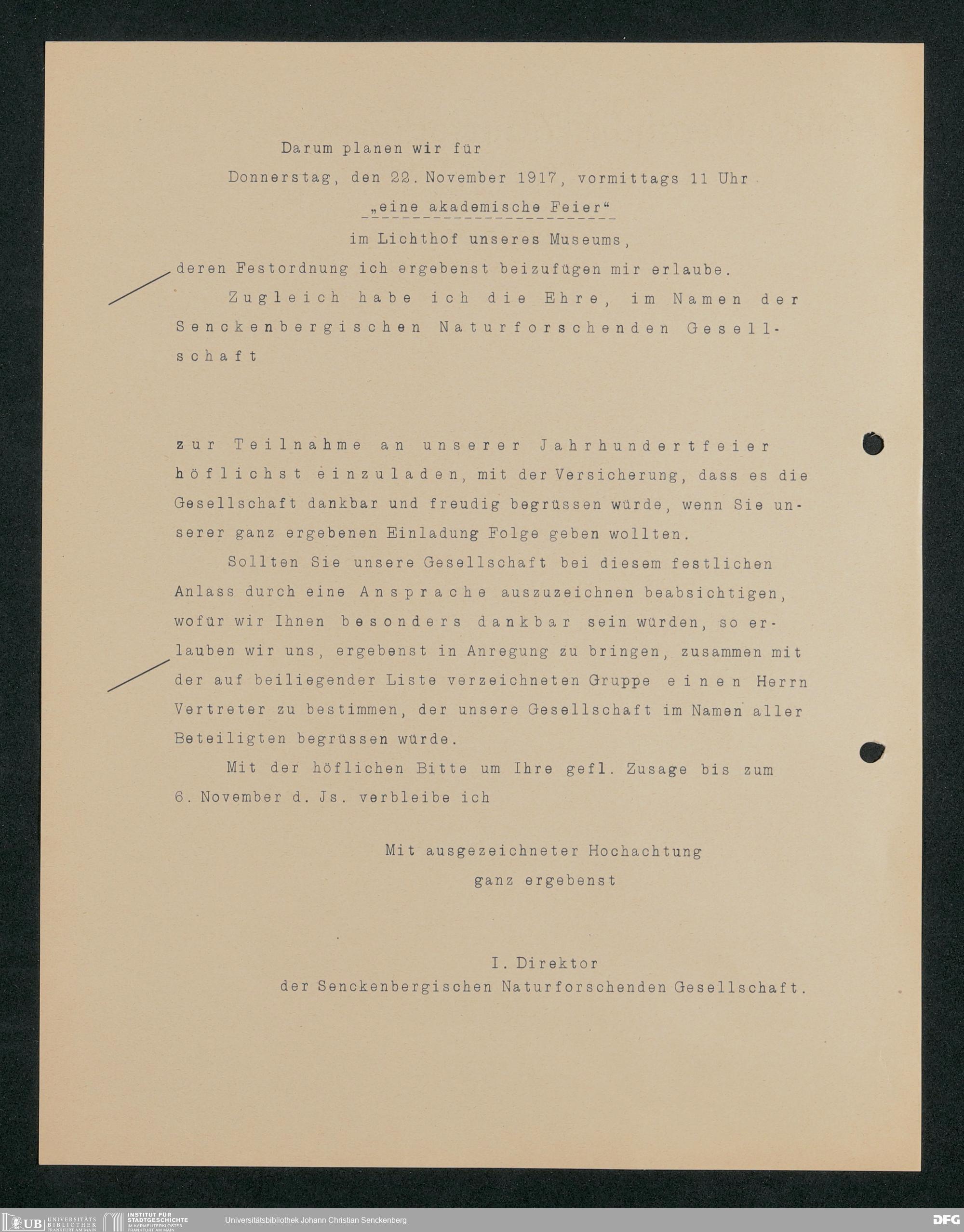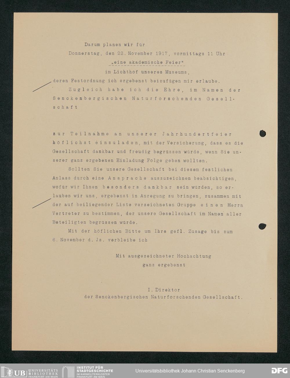 V176 Senckenberg Gesellschaft für Naturforschung, 371 - Dankschreiben für die anlässlich der Jahrhundertfeier von der Senckenbergischen Naturforschenden Gesellschaft vorgenommenen Ehrungen