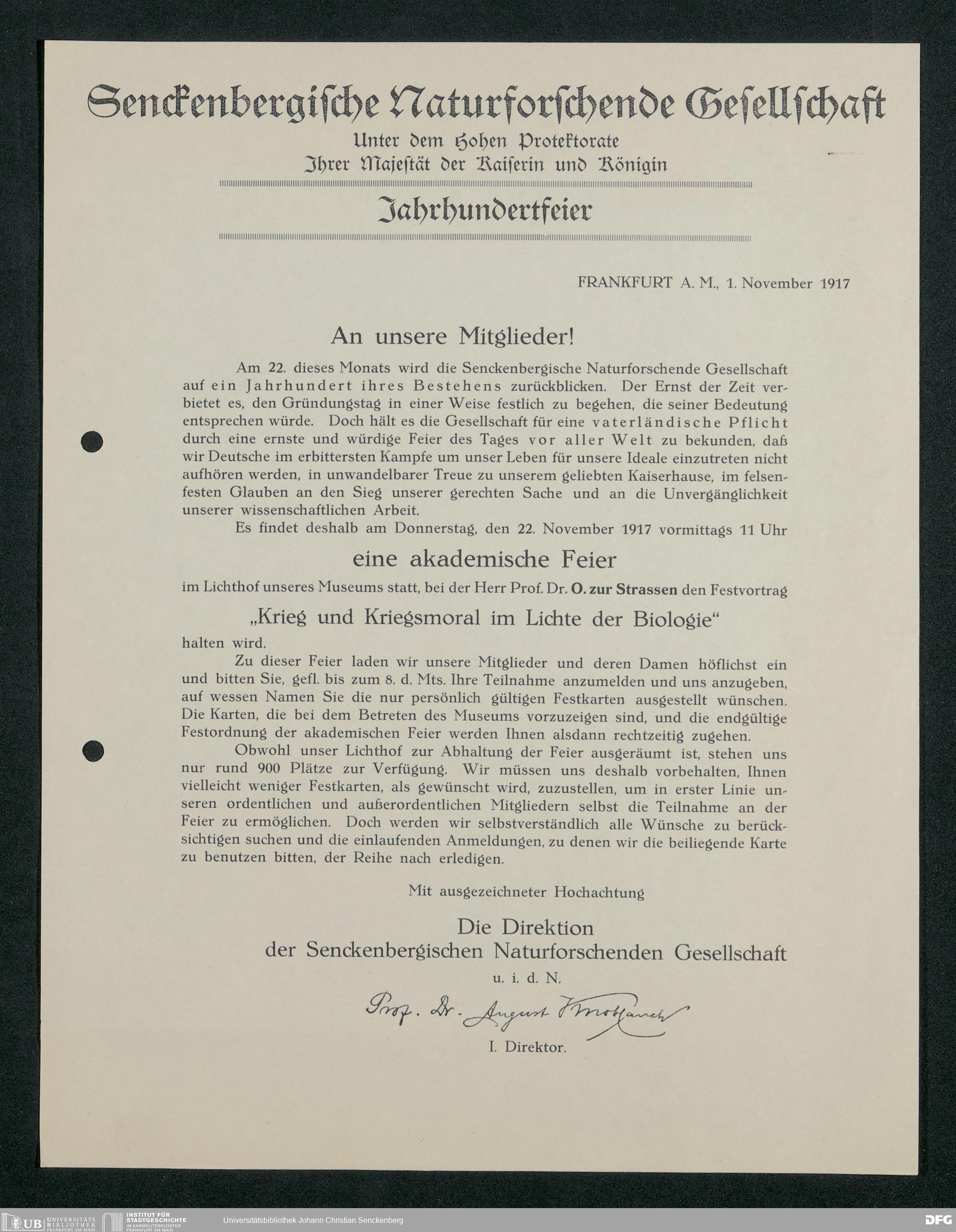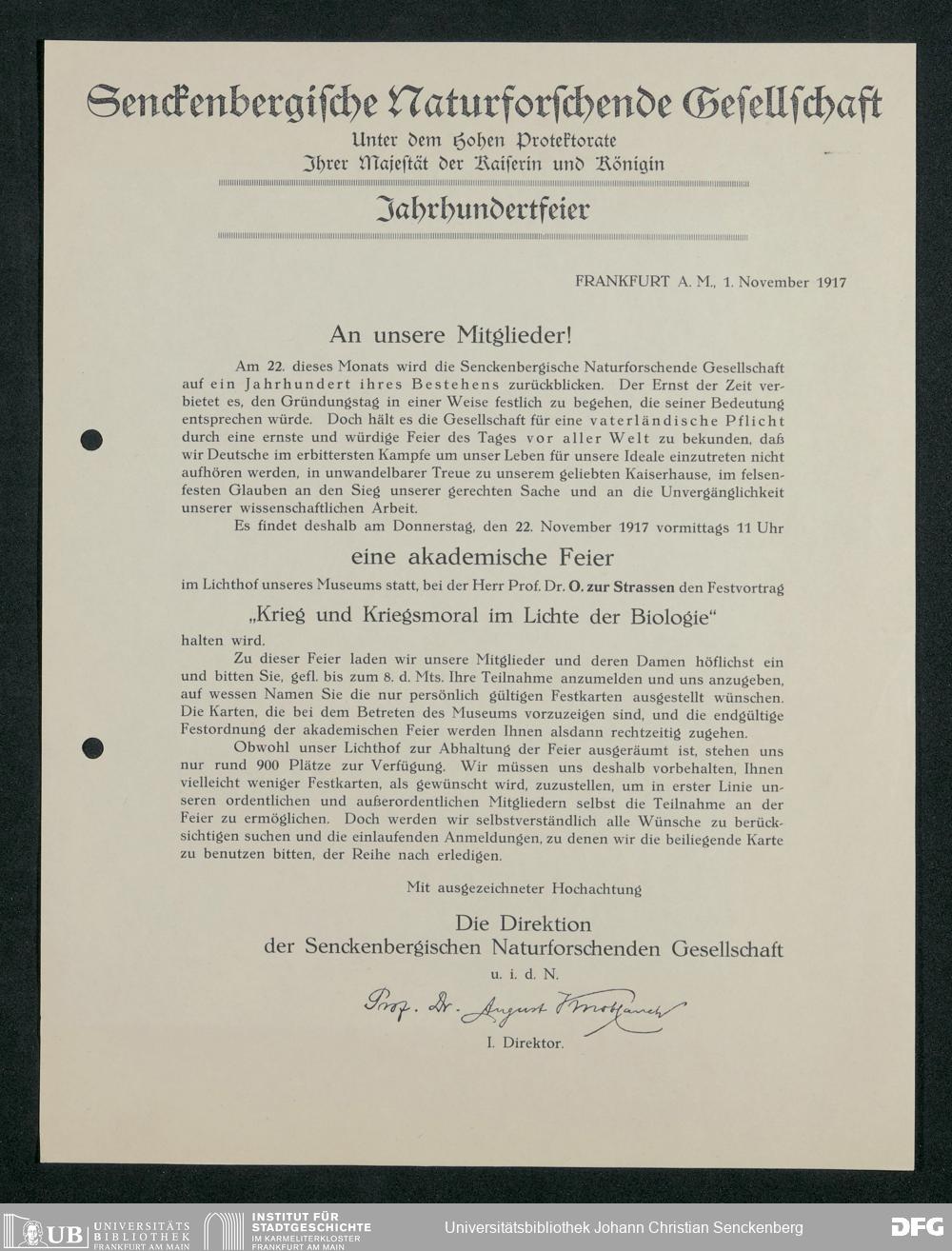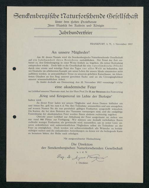 V176 Senckenberg Gesellschaft für Naturforschung, 371 - Dankschreiben für die anlässlich der Jahrhundertfeier von der Senckenbergischen Naturforschenden Gesellschaft vorgenommenen Ehrungen