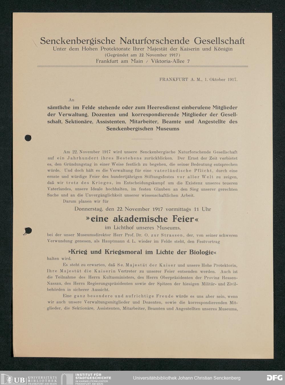 V176 Senckenberg Gesellschaft für Naturforschung, 371 - Dankschreiben für die anlässlich der Jahrhundertfeier von der Senckenbergischen Naturforschenden Gesellschaft vorgenommenen Ehrungen