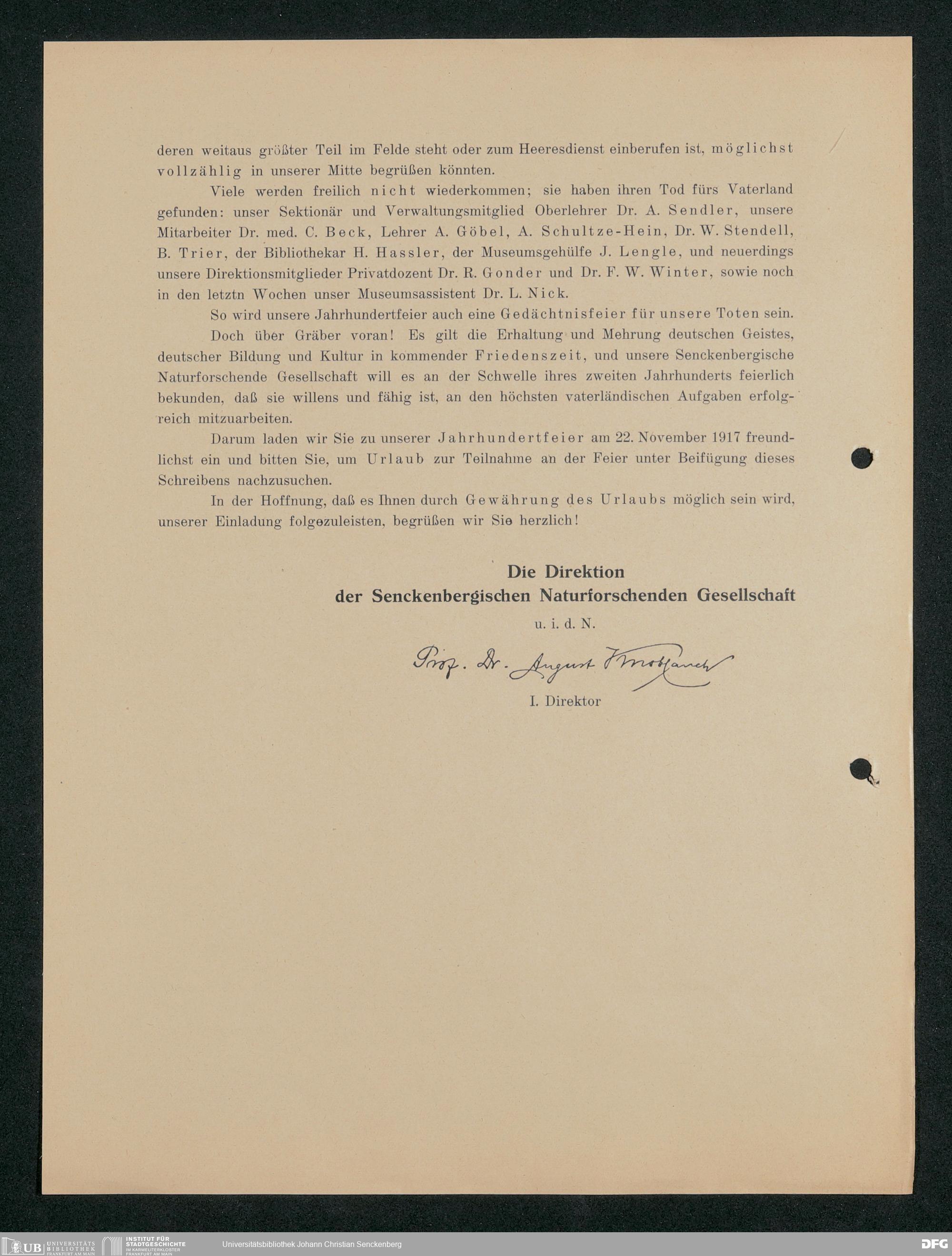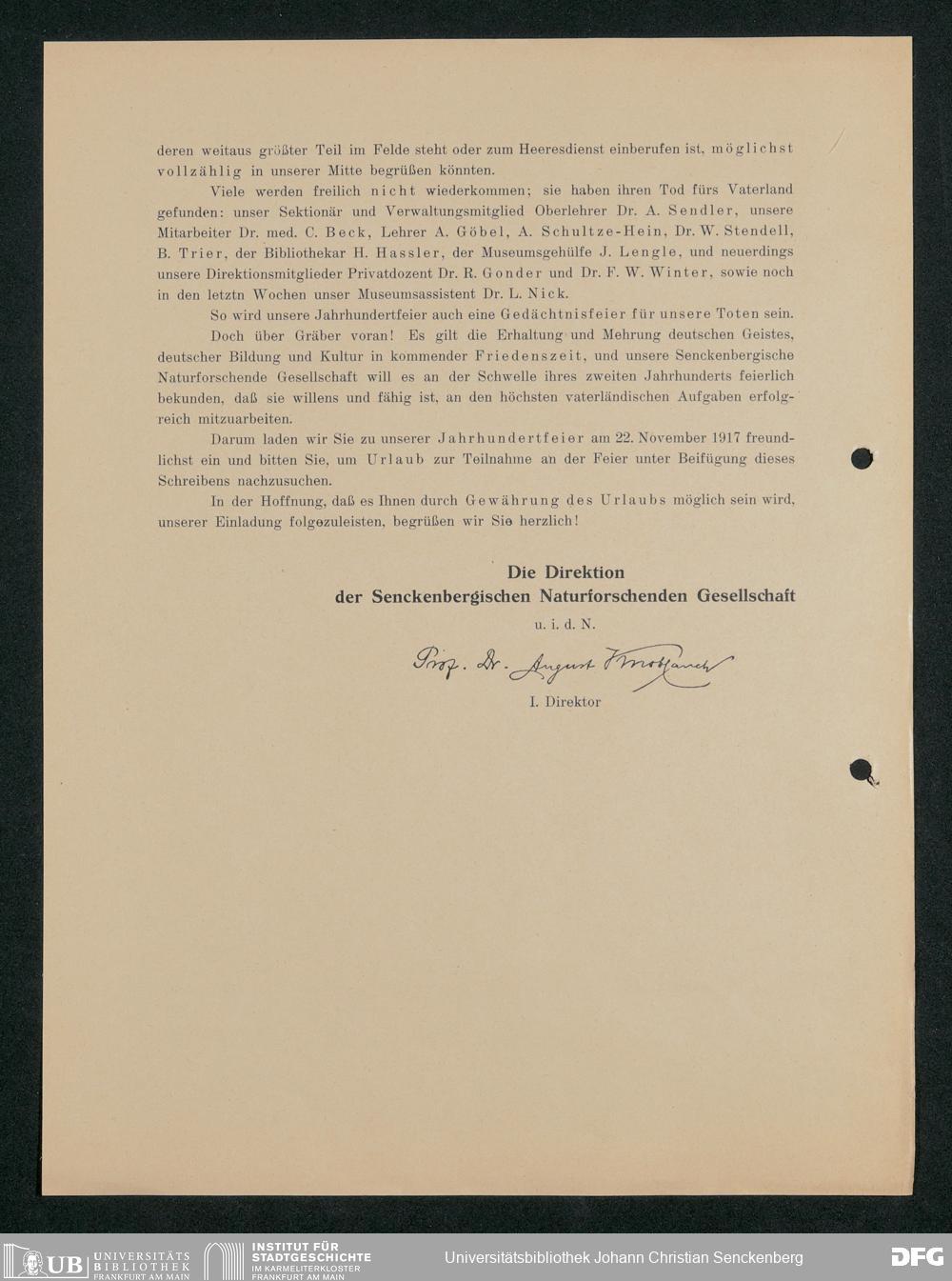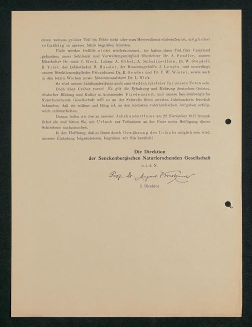 V176 Senckenberg Gesellschaft für Naturforschung, 371 - Dankschreiben für die anlässlich der Jahrhundertfeier von der Senckenbergischen Naturforschenden Gesellschaft vorgenommenen Ehrungen
