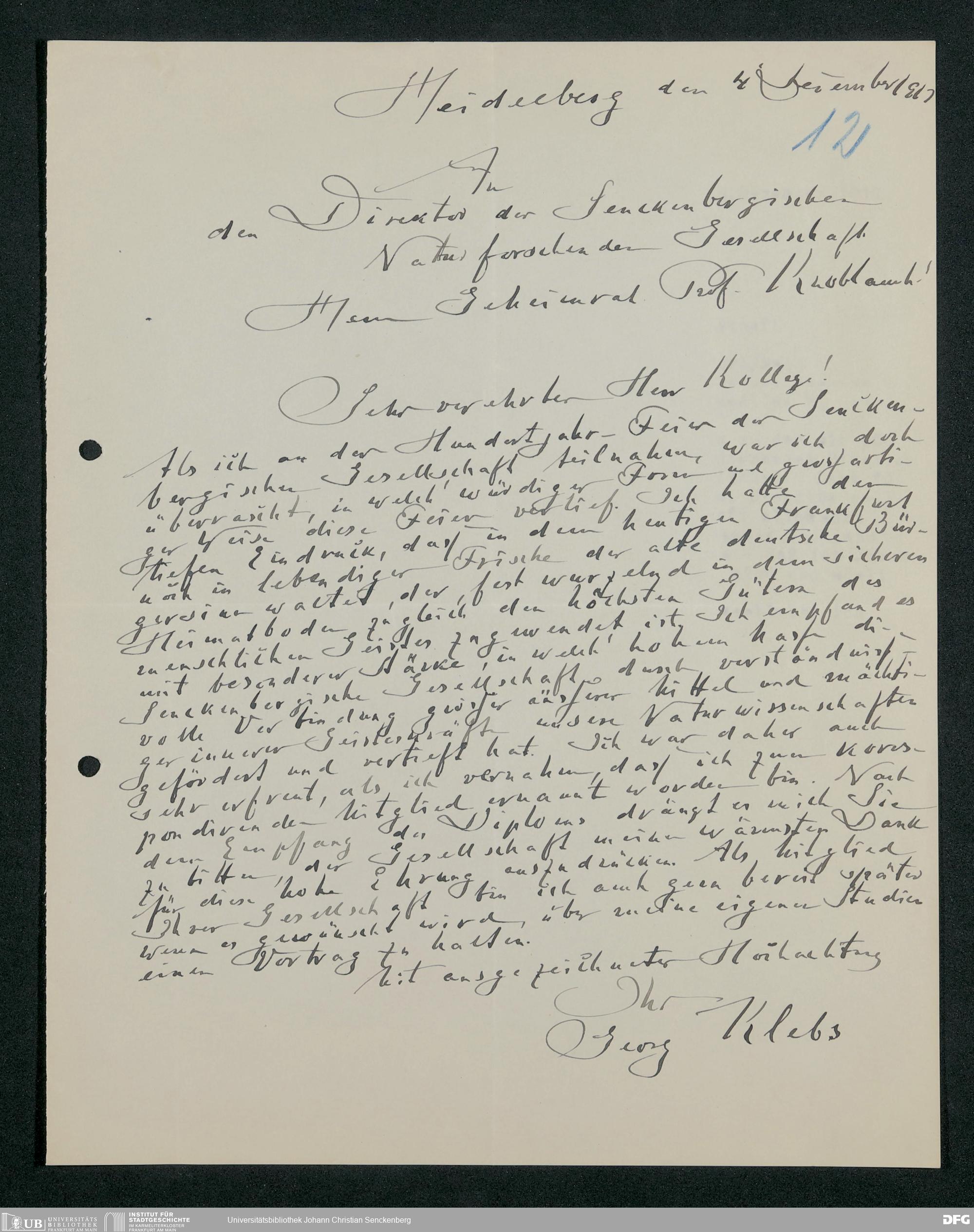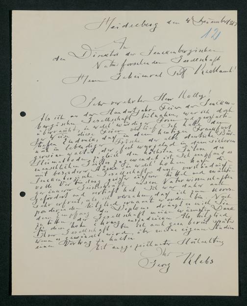 V176 Senckenberg Gesellschaft für Naturforschung, 371 - Dankschreiben für die anlässlich der Jahrhundertfeier von der Senckenbergischen Naturforschenden Gesellschaft vorgenommenen Ehrungen