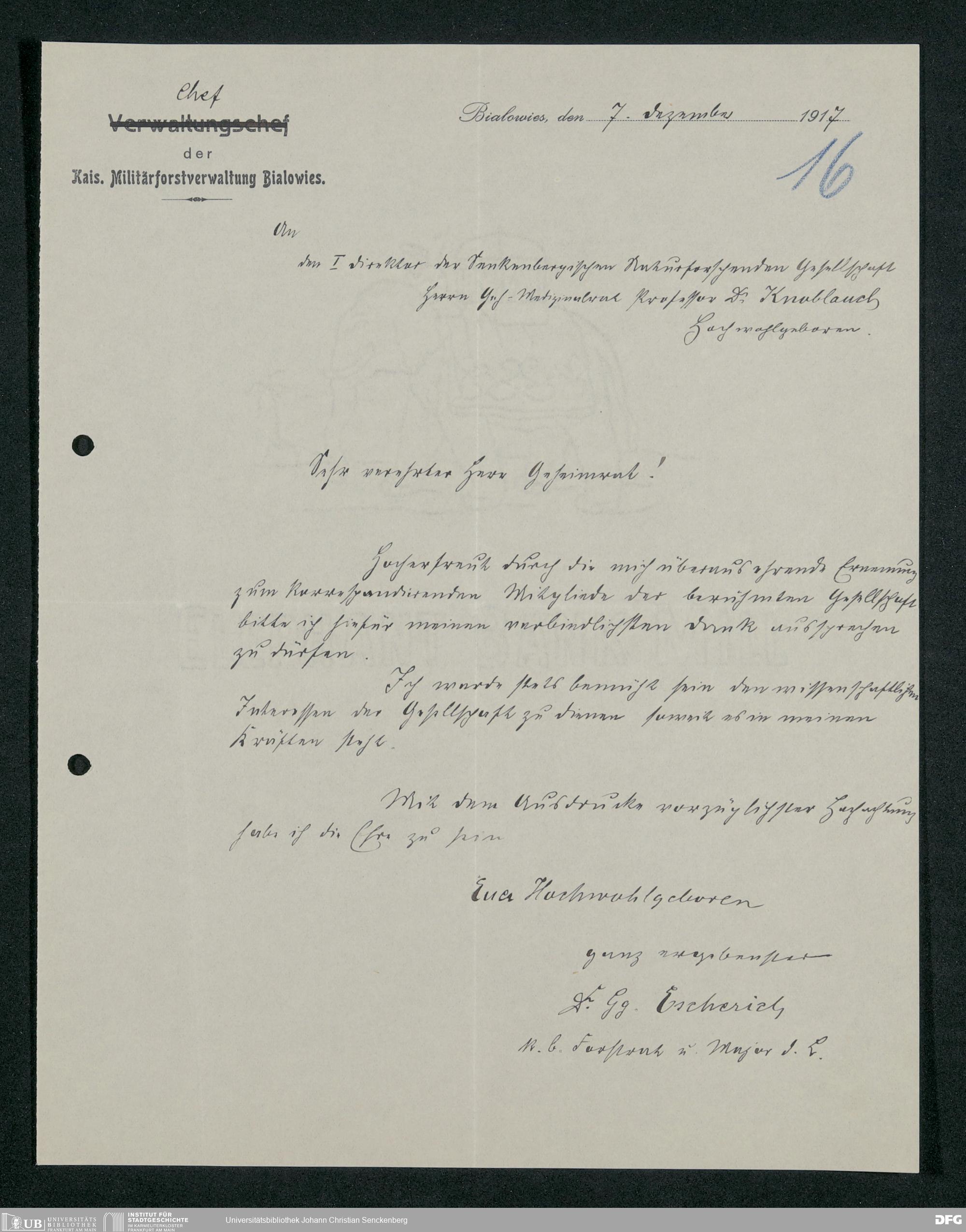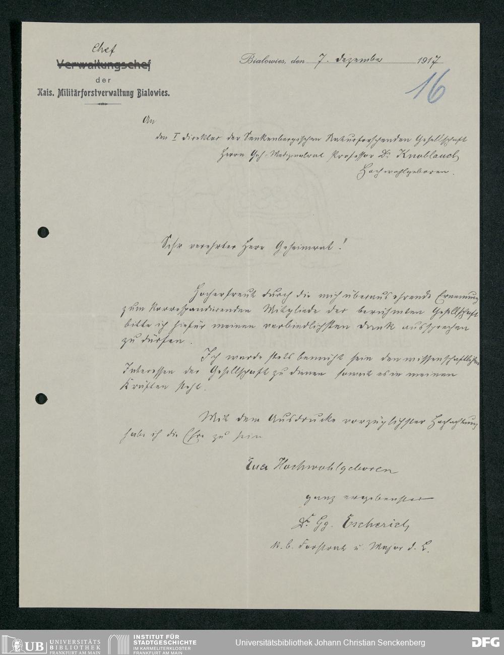 V176 Senckenberg Gesellschaft für Naturforschung, 371 - Dankschreiben für die anlässlich der Jahrhundertfeier von der Senckenbergischen Naturforschenden Gesellschaft vorgenommenen Ehrungen