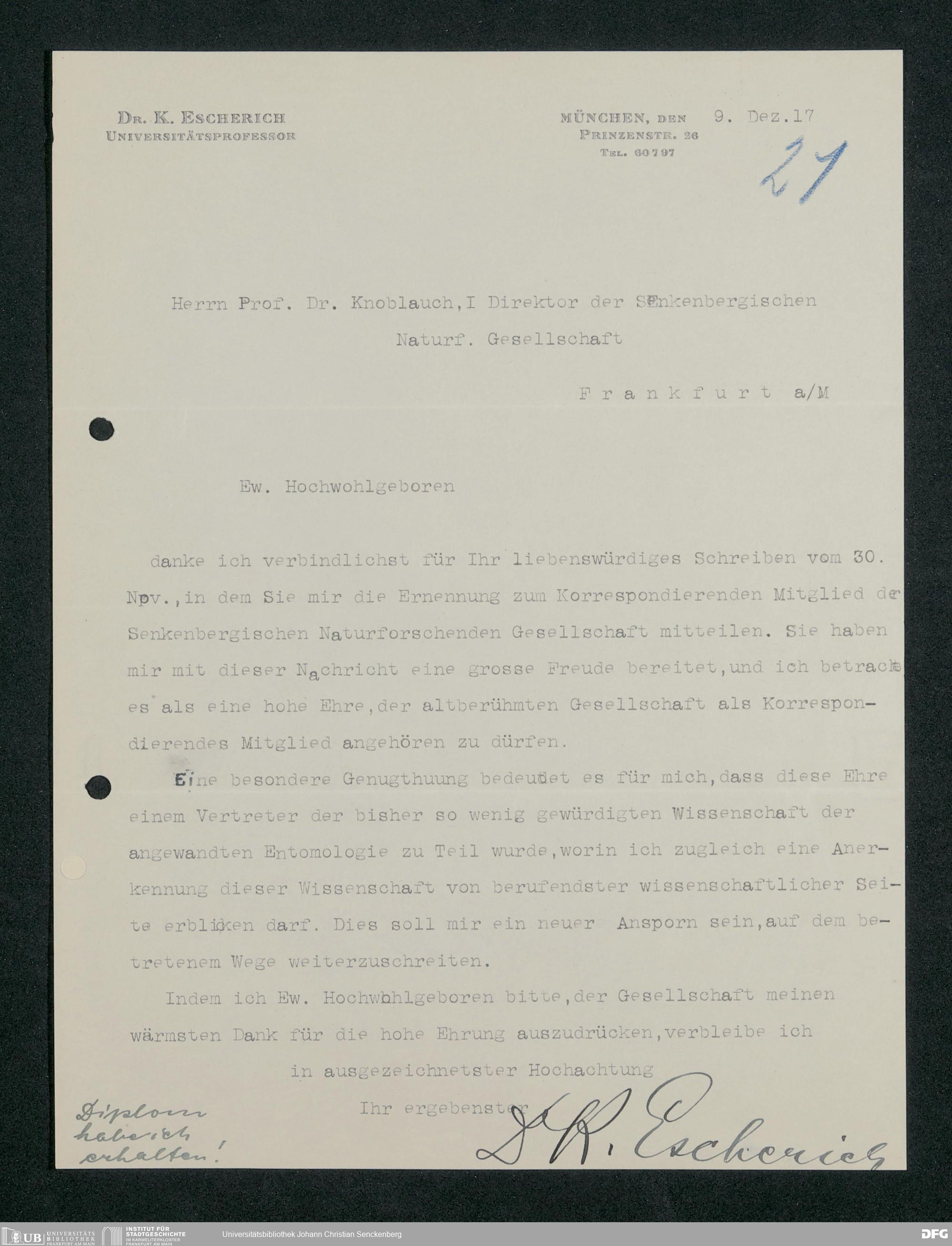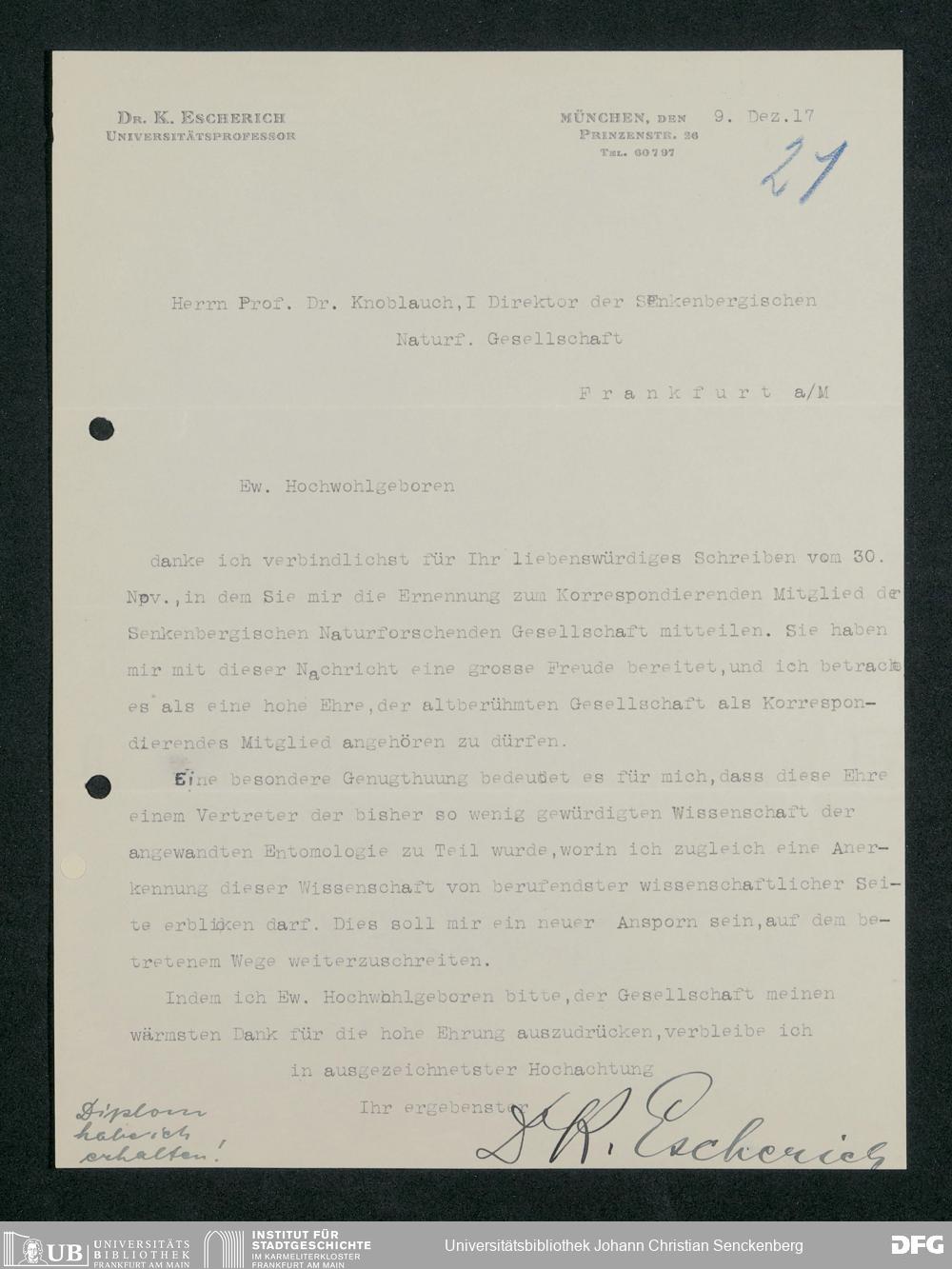 V176 Senckenberg Gesellschaft für Naturforschung, 371 - Dankschreiben für die anlässlich der Jahrhundertfeier von der Senckenbergischen Naturforschenden Gesellschaft vorgenommenen Ehrungen