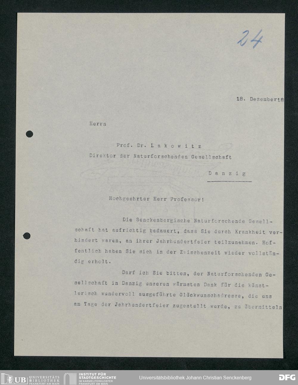 V176 Senckenberg Gesellschaft für Naturforschung, 371 - Dankschreiben für die anlässlich der Jahrhundertfeier von der Senckenbergischen Naturforschenden Gesellschaft vorgenommenen Ehrungen