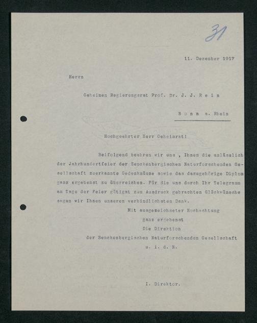 V176 Senckenberg Gesellschaft für Naturforschung, 371 - Dankschreiben für die anlässlich der Jahrhundertfeier von der Senckenbergischen Naturforschenden Gesellschaft vorgenommenen Ehrungen