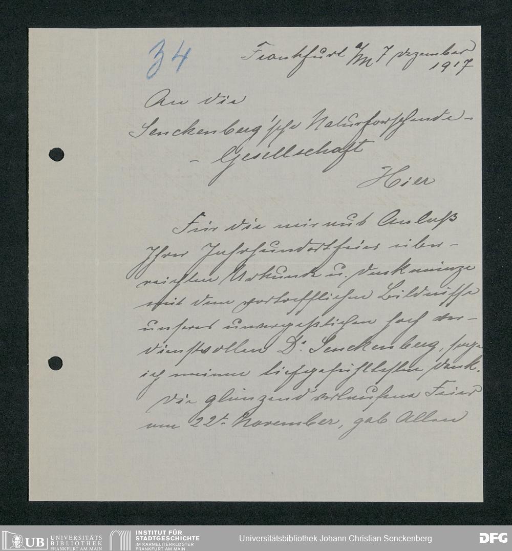 V176 Senckenberg Gesellschaft für Naturforschung, 371 - Dankschreiben für die anlässlich der Jahrhundertfeier von der Senckenbergischen Naturforschenden Gesellschaft vorgenommenen Ehrungen