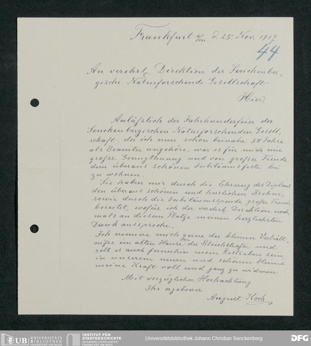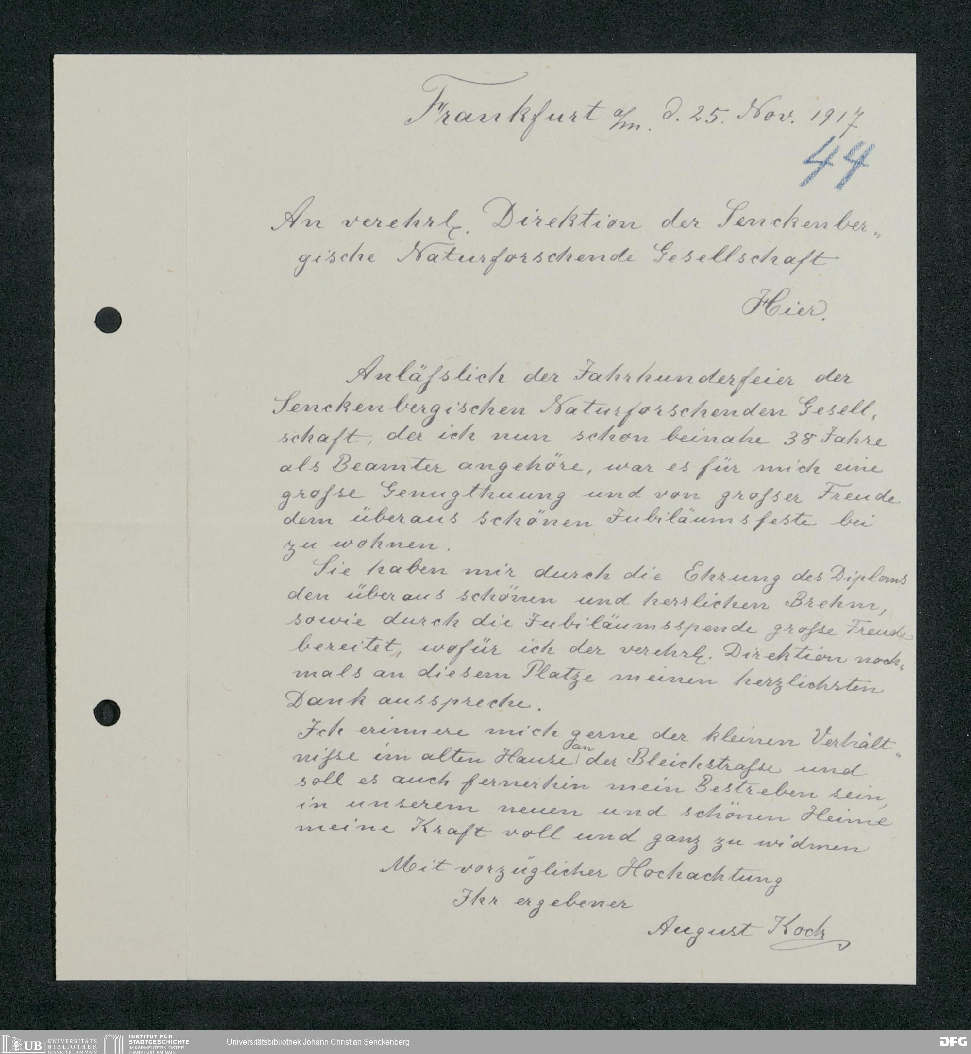 V176 Senckenberg Gesellschaft für Naturforschung, 371 - Dankschreiben für die anlässlich der Jahrhundertfeier von der Senckenbergischen Naturforschenden Gesellschaft vorgenommenen Ehrungen