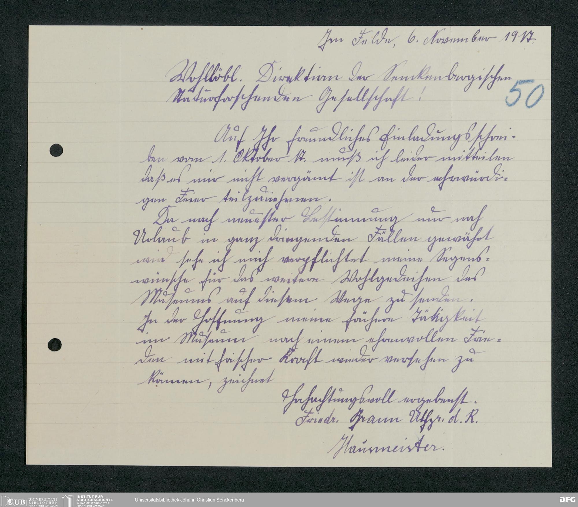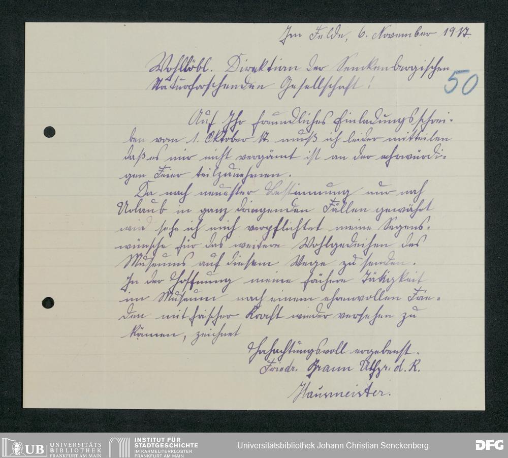 V176 Senckenberg Gesellschaft für Naturforschung, 371 - Dankschreiben für die anlässlich der Jahrhundertfeier von der Senckenbergischen Naturforschenden Gesellschaft vorgenommenen Ehrungen