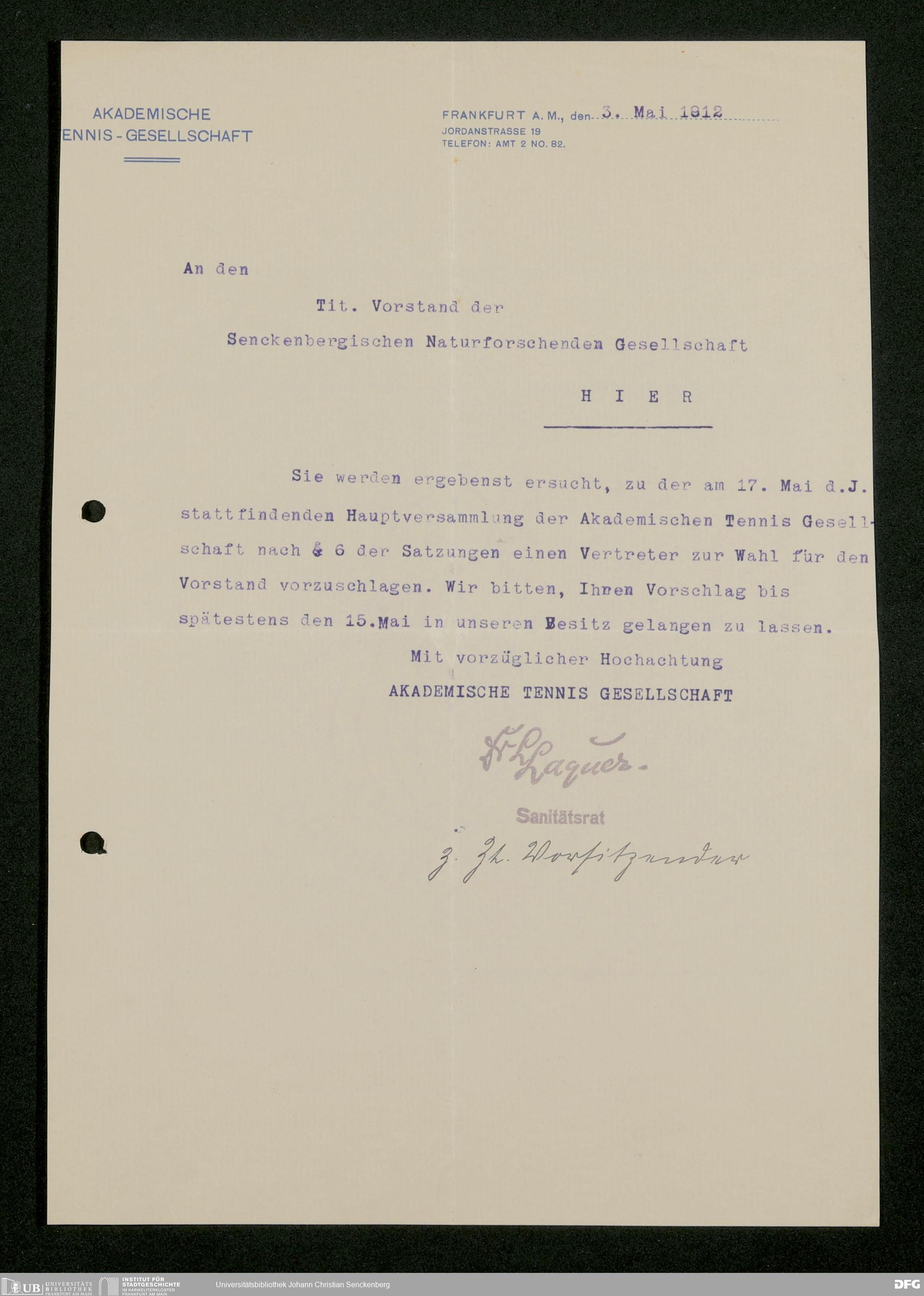 V176 Senckenberg Gesellschaft für Naturforschung, 445 - Pachtung von städtischem Gelände an der Viktoria-Allee durch die anliegenden wissenschaftlichen Institute zwecks Errichtung von Park- und Tennisanlagen