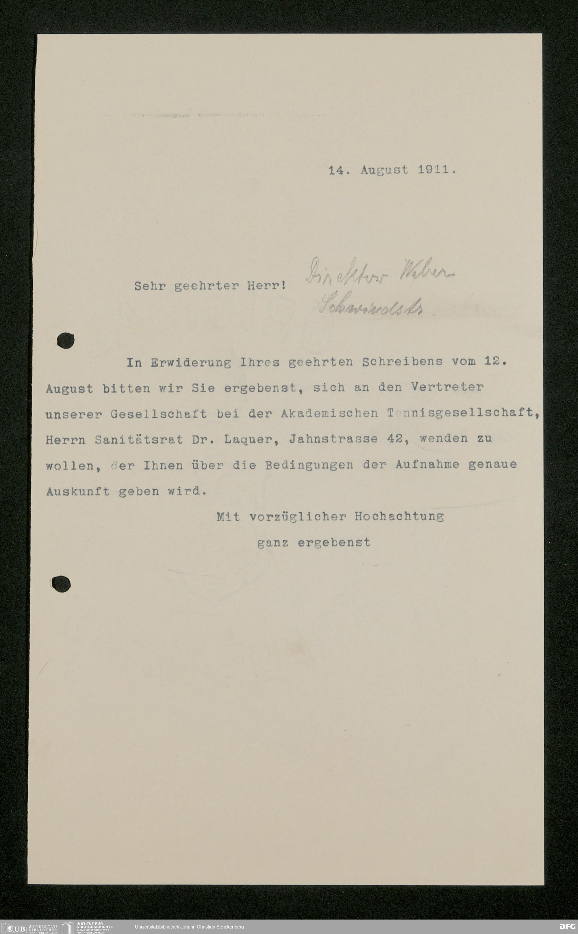 V176 Senckenberg Gesellschaft für Naturforschung, 445 - Pachtung von städtischem Gelände an der Viktoria-Allee durch die anliegenden wissenschaftlichen Institute zwecks Errichtung von Park- und Tennisanlagen