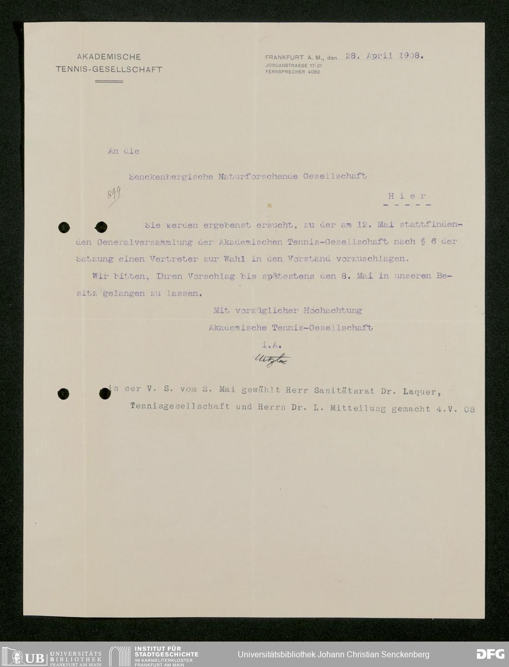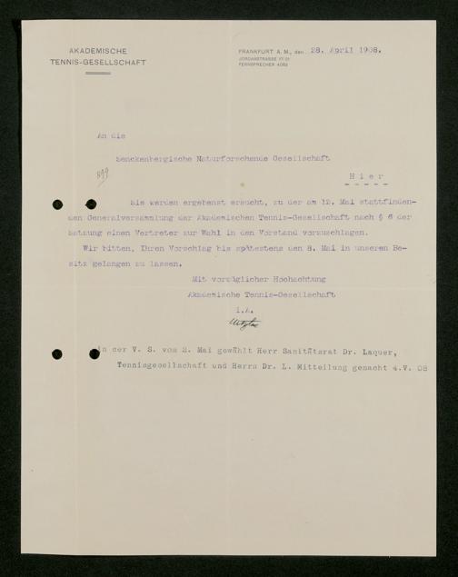 V176 Senckenberg Gesellschaft für Naturforschung, 445 - Pachtung von städtischem Gelände an der Viktoria-Allee durch die anliegenden wissenschaftlichen Institute zwecks Errichtung von Park- und Tennisanlagen
