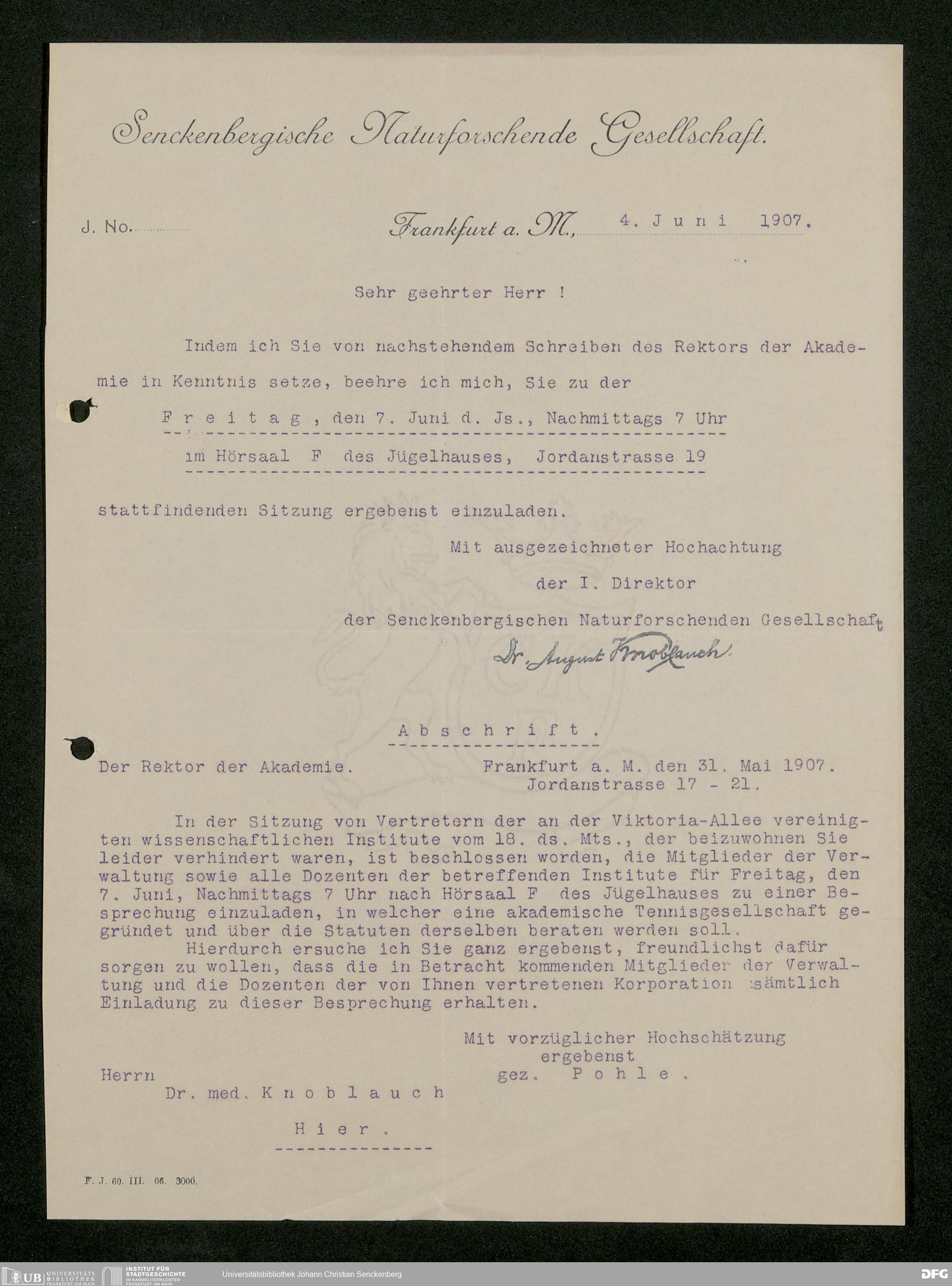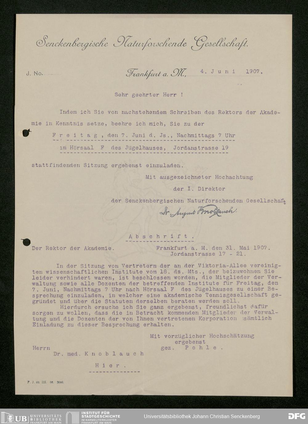 V176 Senckenberg Gesellschaft für Naturforschung, 445 - Pachtung von städtischem Gelände an der Viktoria-Allee durch die anliegenden wissenschaftlichen Institute zwecks Errichtung von Park- und Tennisanlagen