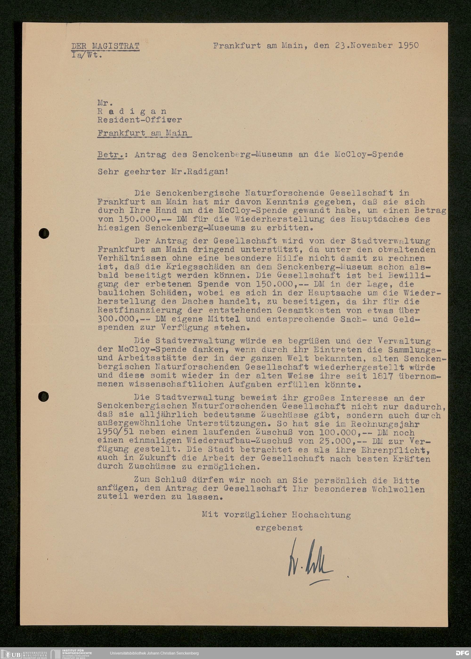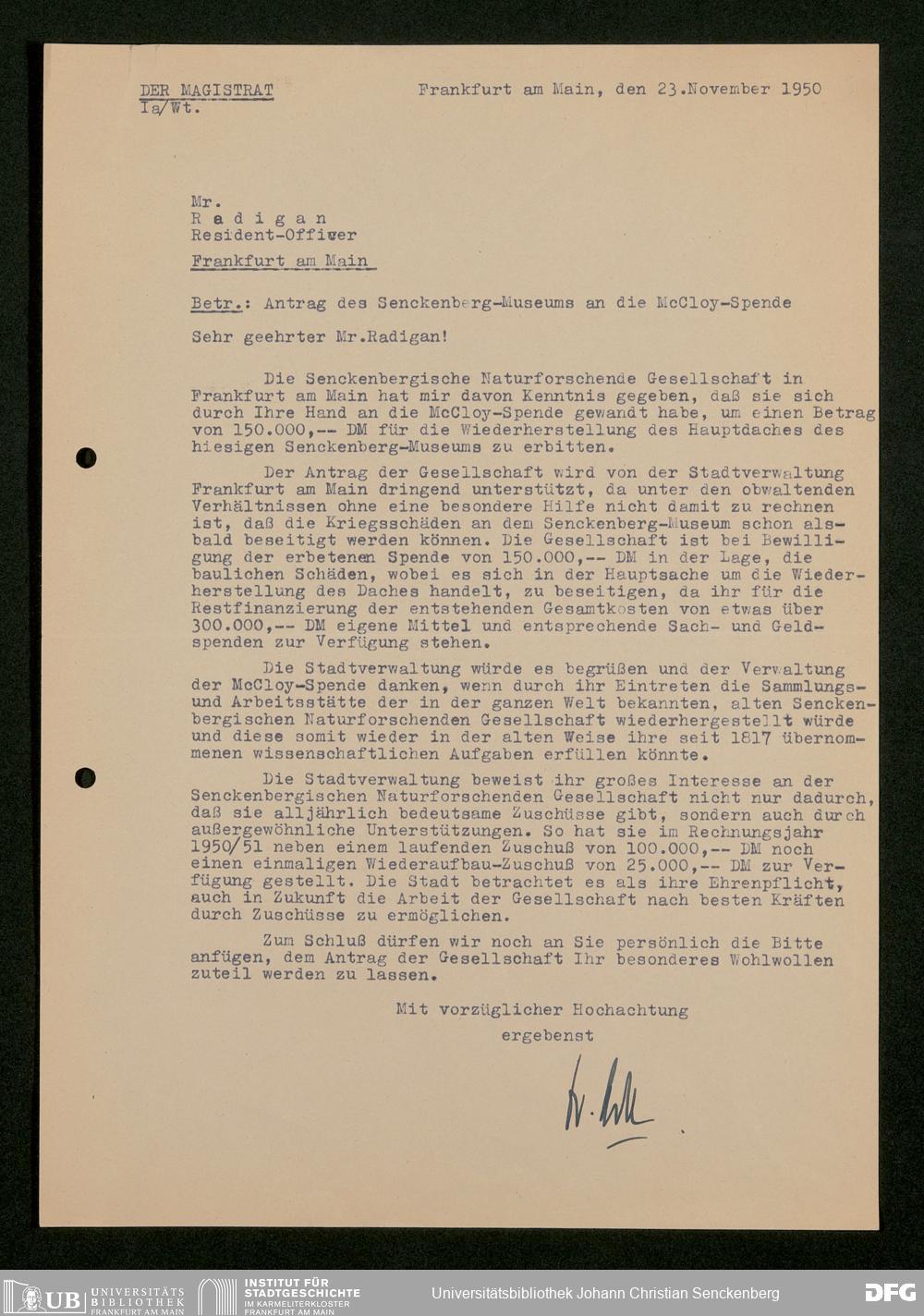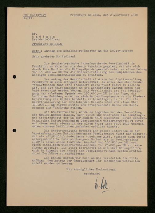 V176 Senckenberg Gesellschaft für Naturforschung, 472 - Antrag auf Unterstützung des Wiederaufbaus des Senckenbergmuseums aus Mitteln des McCloy-Fonds