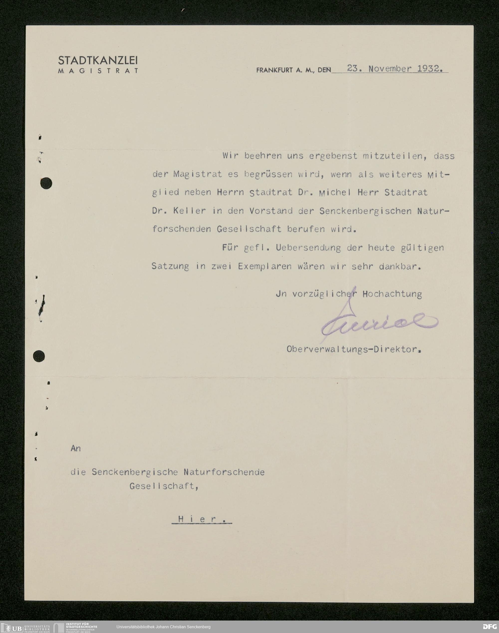 V176 Senckenberg Gesellschaft für Naturforschung, 473 - Korrespondenz mit städtischen Behörden