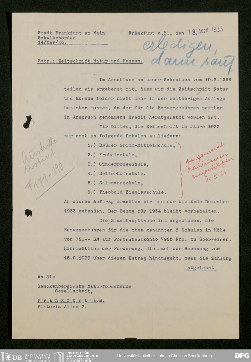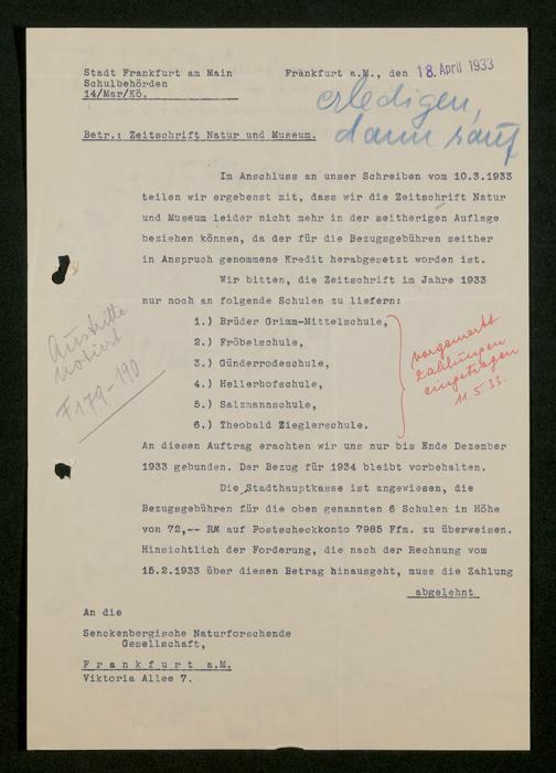 V176 Senckenberg Gesellschaft für Naturforschung, 473 - Korrespondenz mit städtischen Behörden