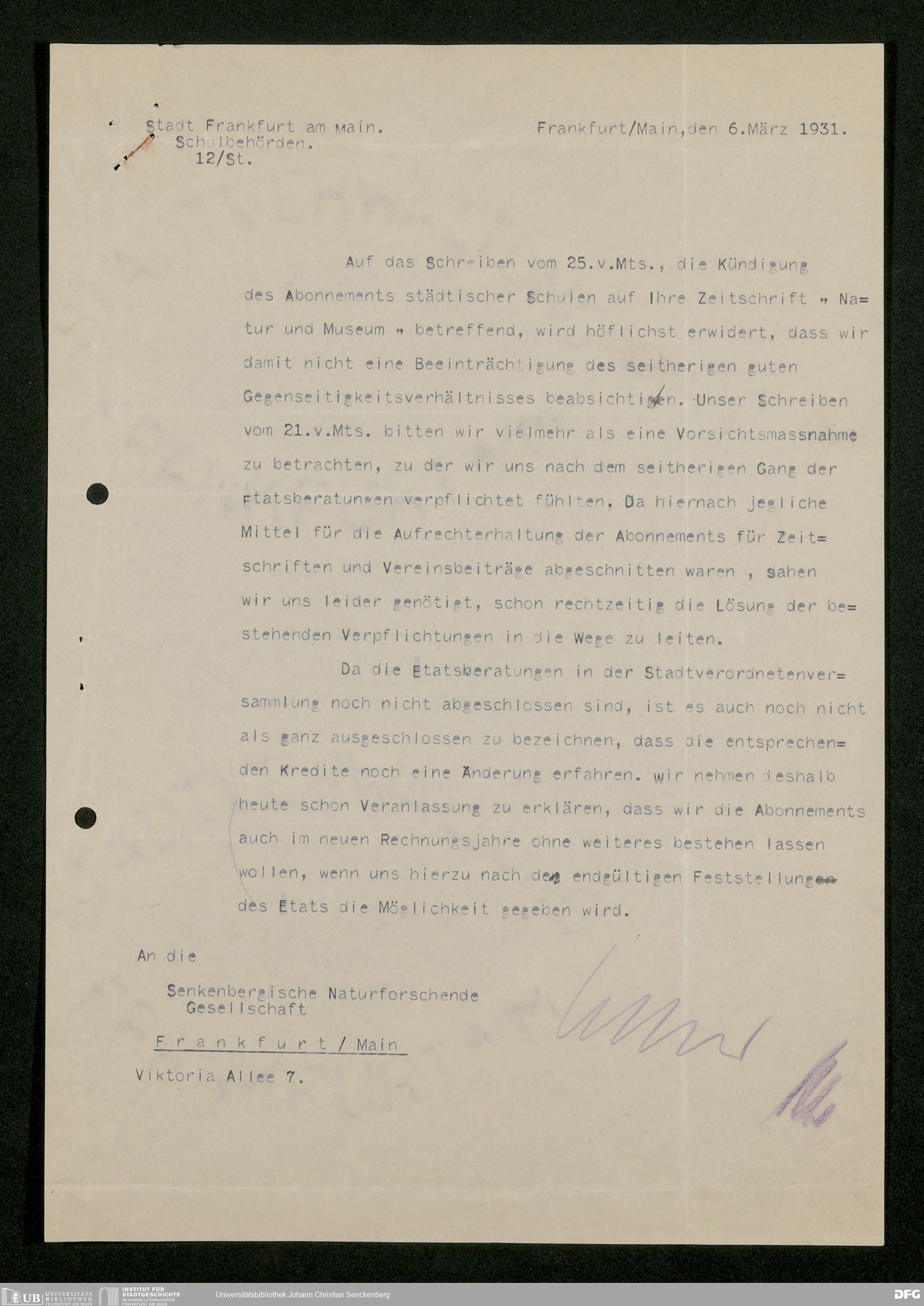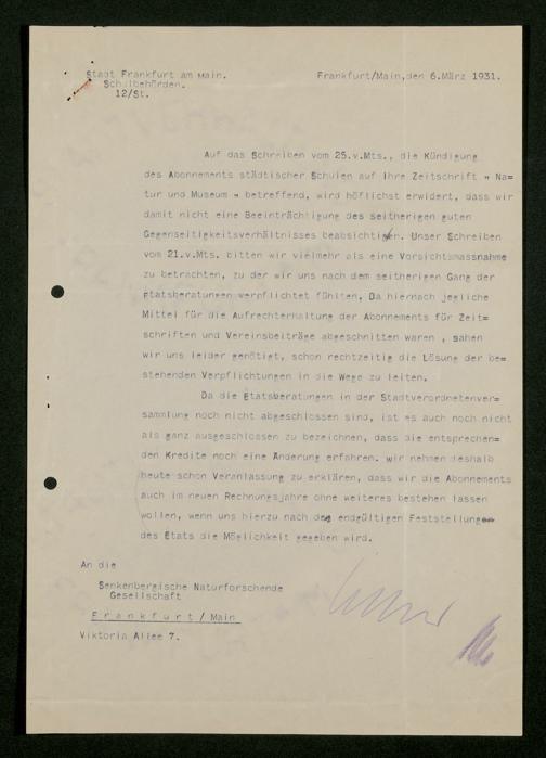 V176 Senckenberg Gesellschaft für Naturforschung, 473 - Korrespondenz mit städtischen Behörden