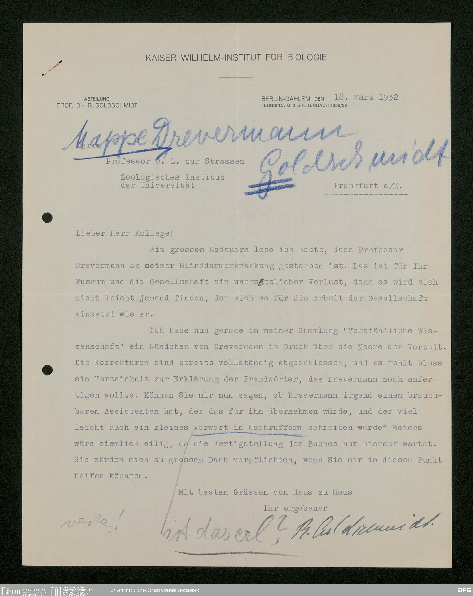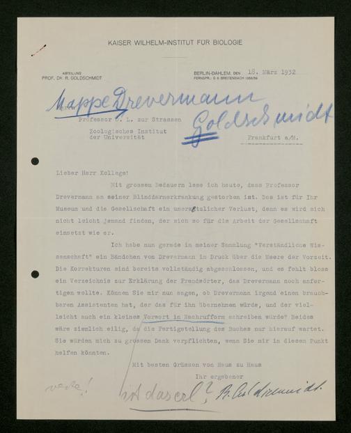 V176 Senckenberg Gesellschaft für Naturforschung, 483 - Korrespondenz des geschäftsführenden Direktors Fritz Drevermann