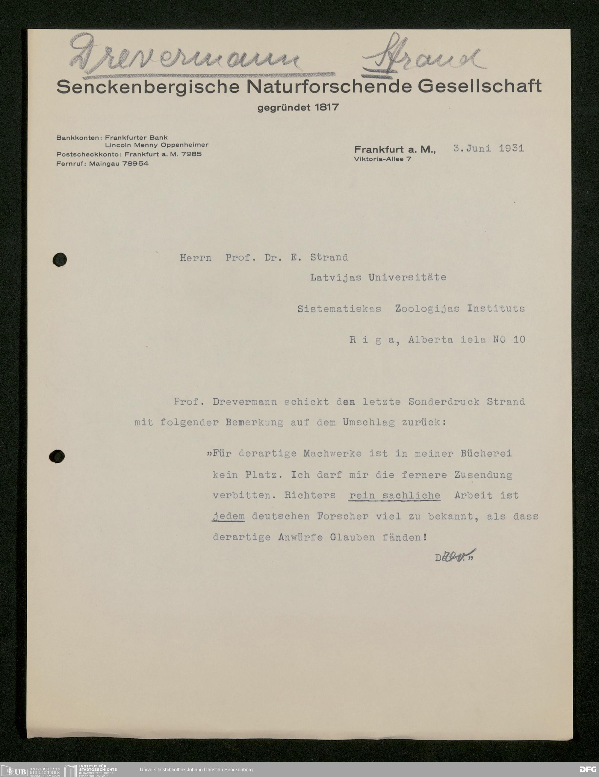 V176 Senckenberg Gesellschaft für Naturforschung, 483 - Korrespondenz des geschäftsführenden Direktors Fritz Drevermann