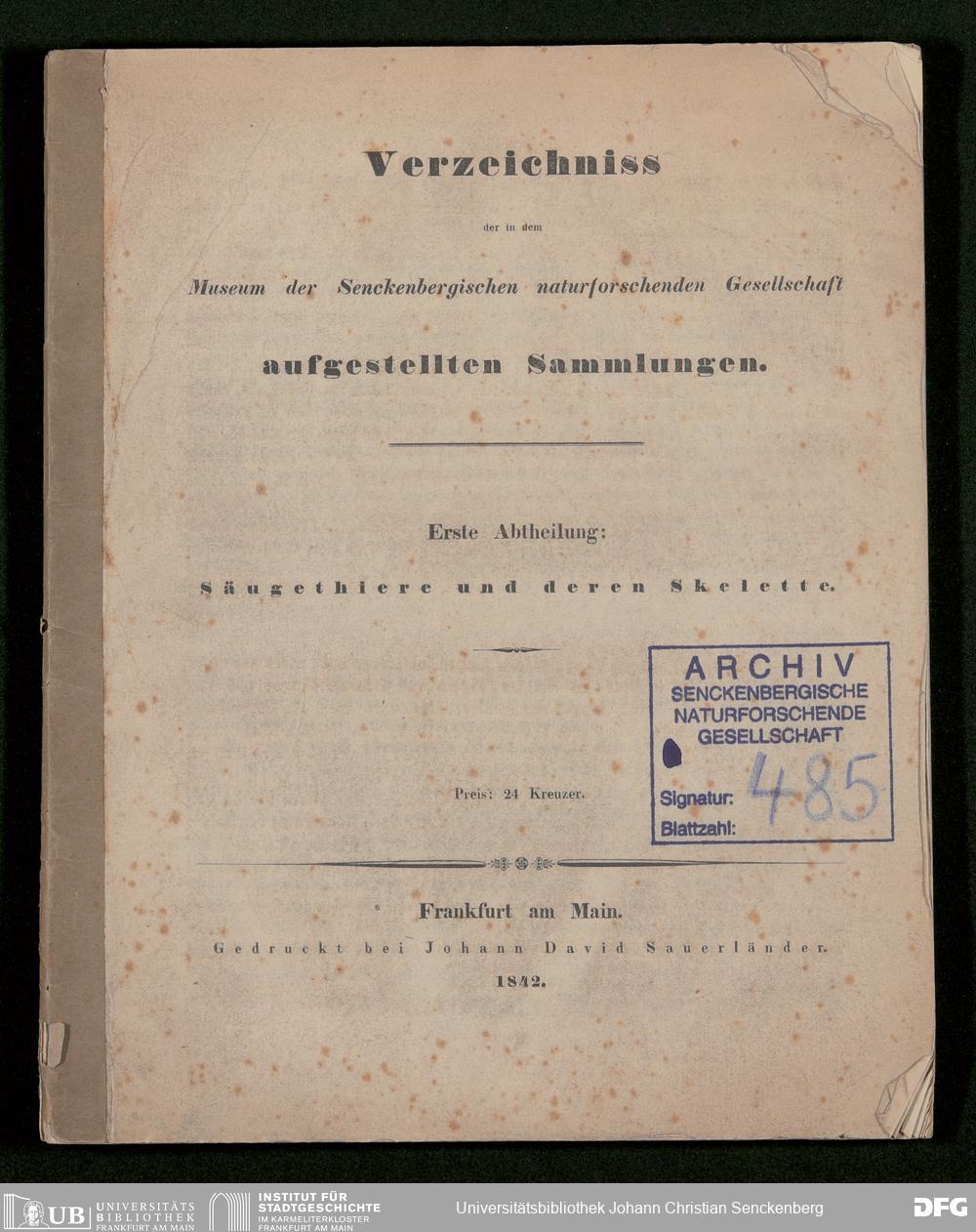 V176 Senckenberg Gesellschaft für Naturforschung, 485 - Eduard Rüppell, "Verzeichnis der in dem Museum der Senckenbergischen Naturforschenden Gesellschaft aufgestellten Sammlungen"