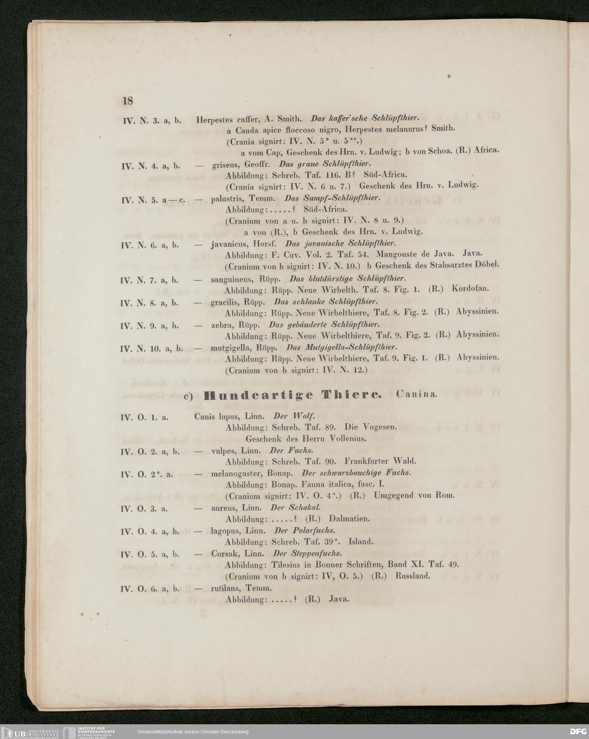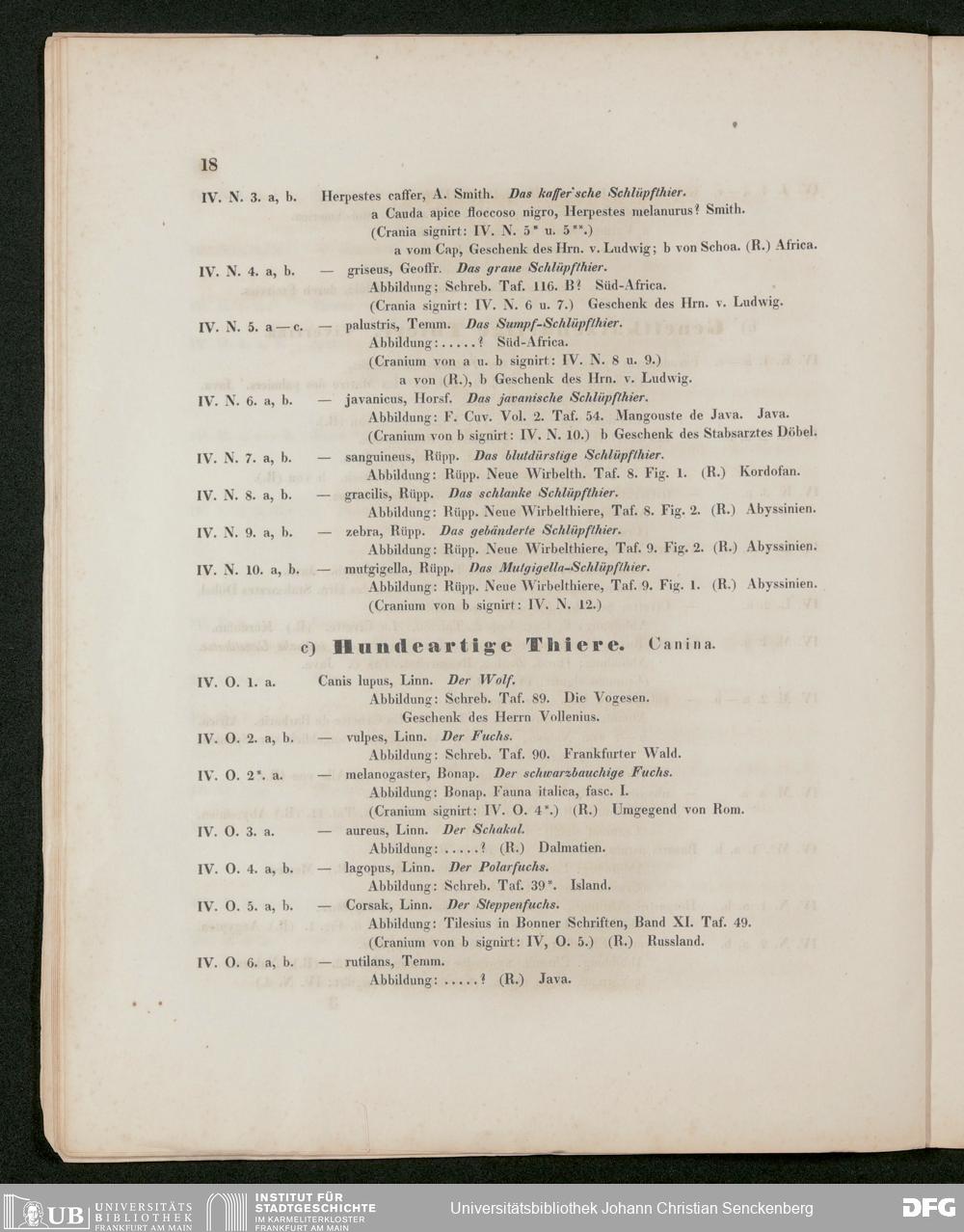 V176 Senckenberg Gesellschaft für Naturforschung, 486 - Eduard Rüppell, "Verzeichnis der in dem Museum der Senckenbergischen Naturforschenden Gesellschaft aufgestellten Sammlungen. Erste Abtheilung: Säugethiere und deren Skelette", Frankfurt a. M. 1842