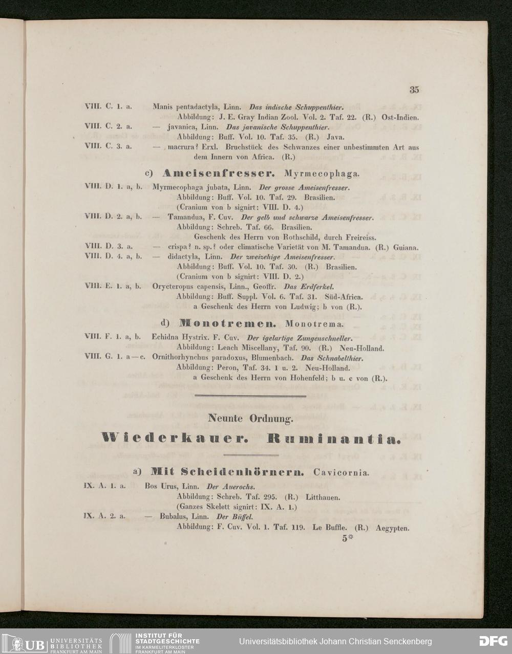 V176 Senckenberg Gesellschaft für Naturforschung, 486 - Eduard Rüppell, "Verzeichnis der in dem Museum der Senckenbergischen Naturforschenden Gesellschaft aufgestellten Sammlungen. Erste Abtheilung: Säugethiere und deren Skelette", Frankfurt a. M. 1842