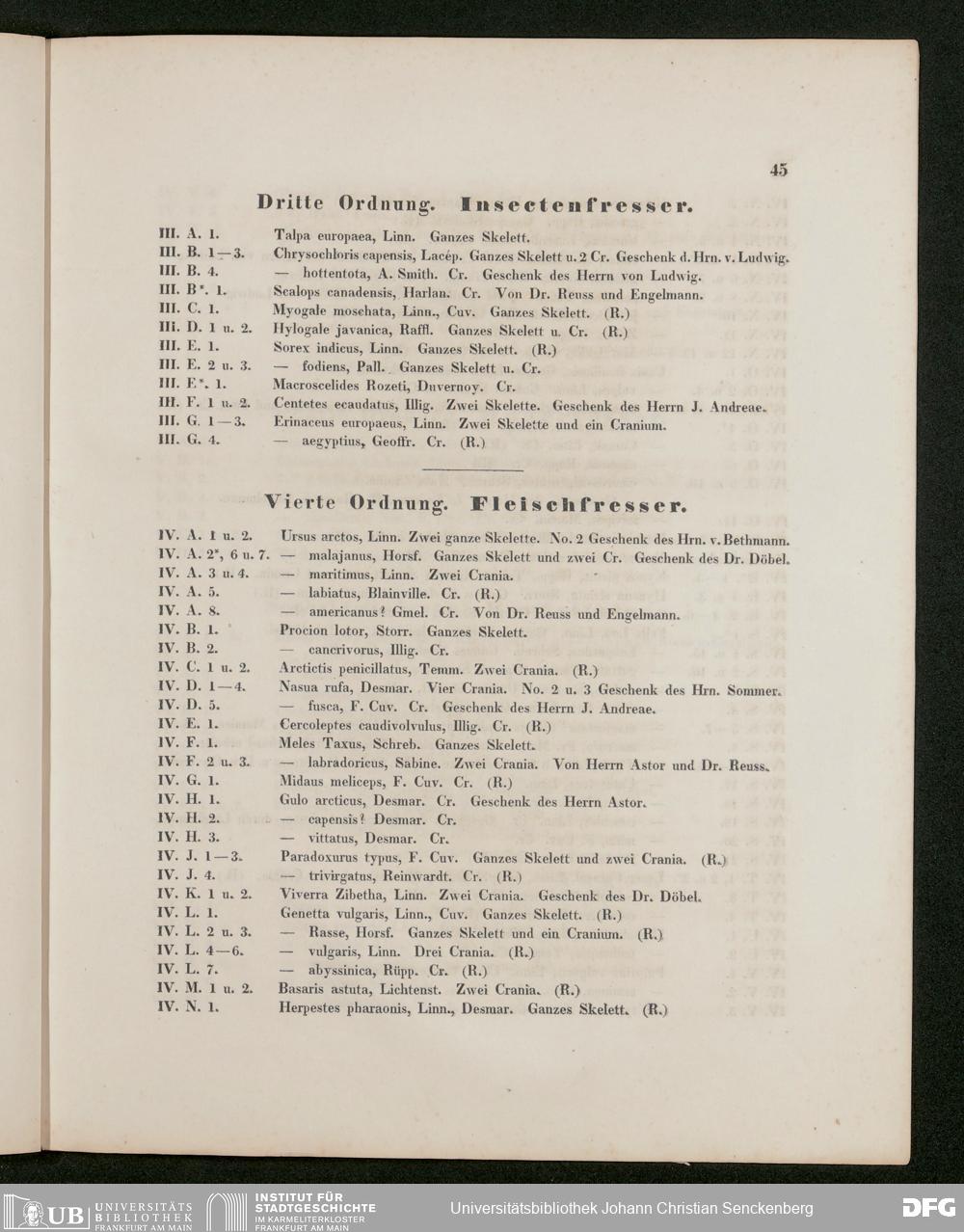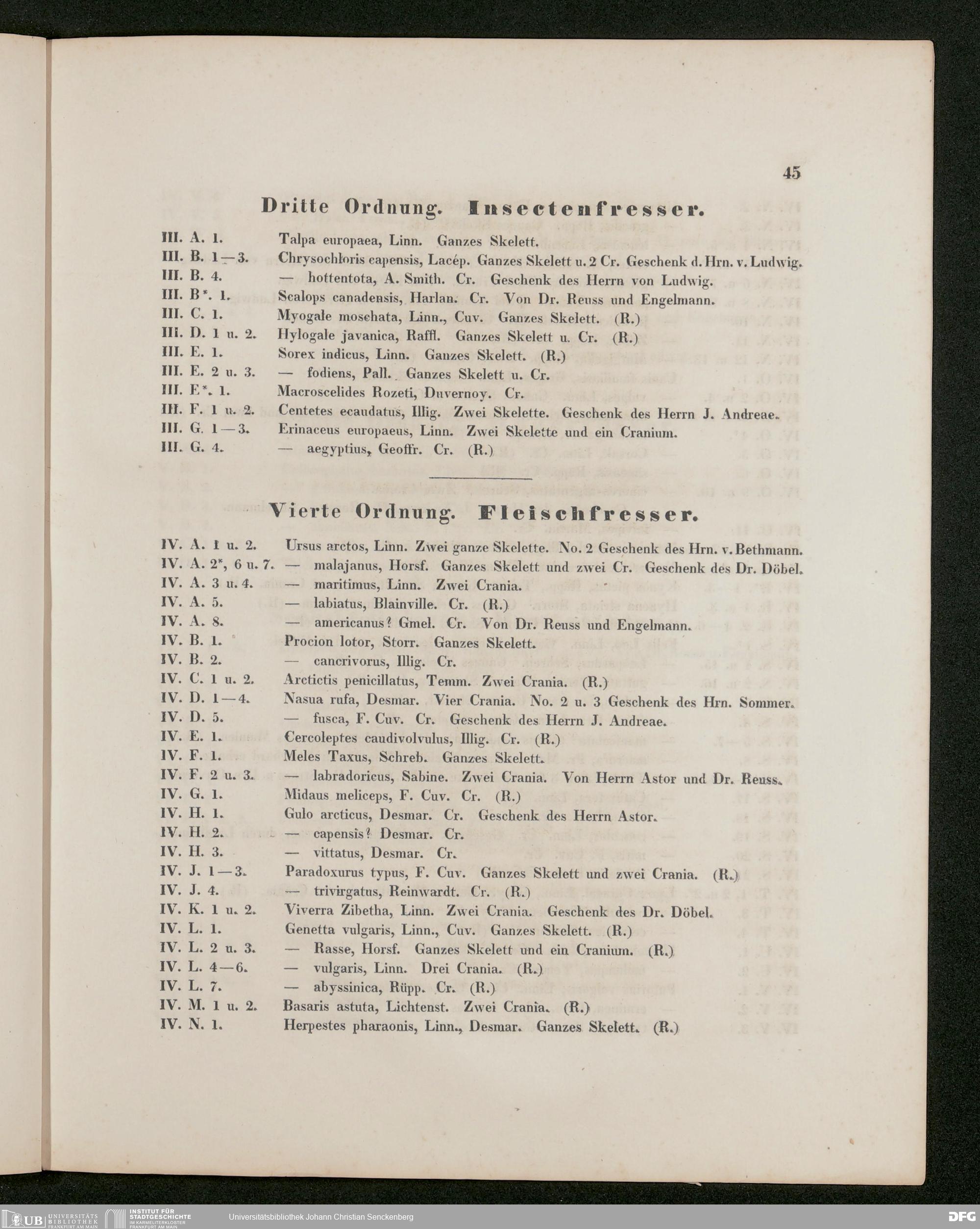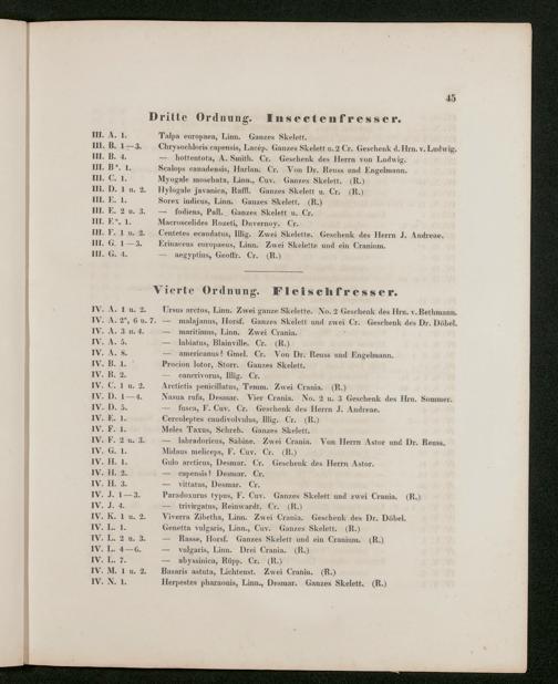 V176 Senckenberg Gesellschaft für Naturforschung, 486 - Eduard Rüppell, "Verzeichnis der in dem Museum der Senckenbergischen Naturforschenden Gesellschaft aufgestellten Sammlungen. Erste Abtheilung: Säugethiere und deren Skelette", Frankfurt a. M. 1842