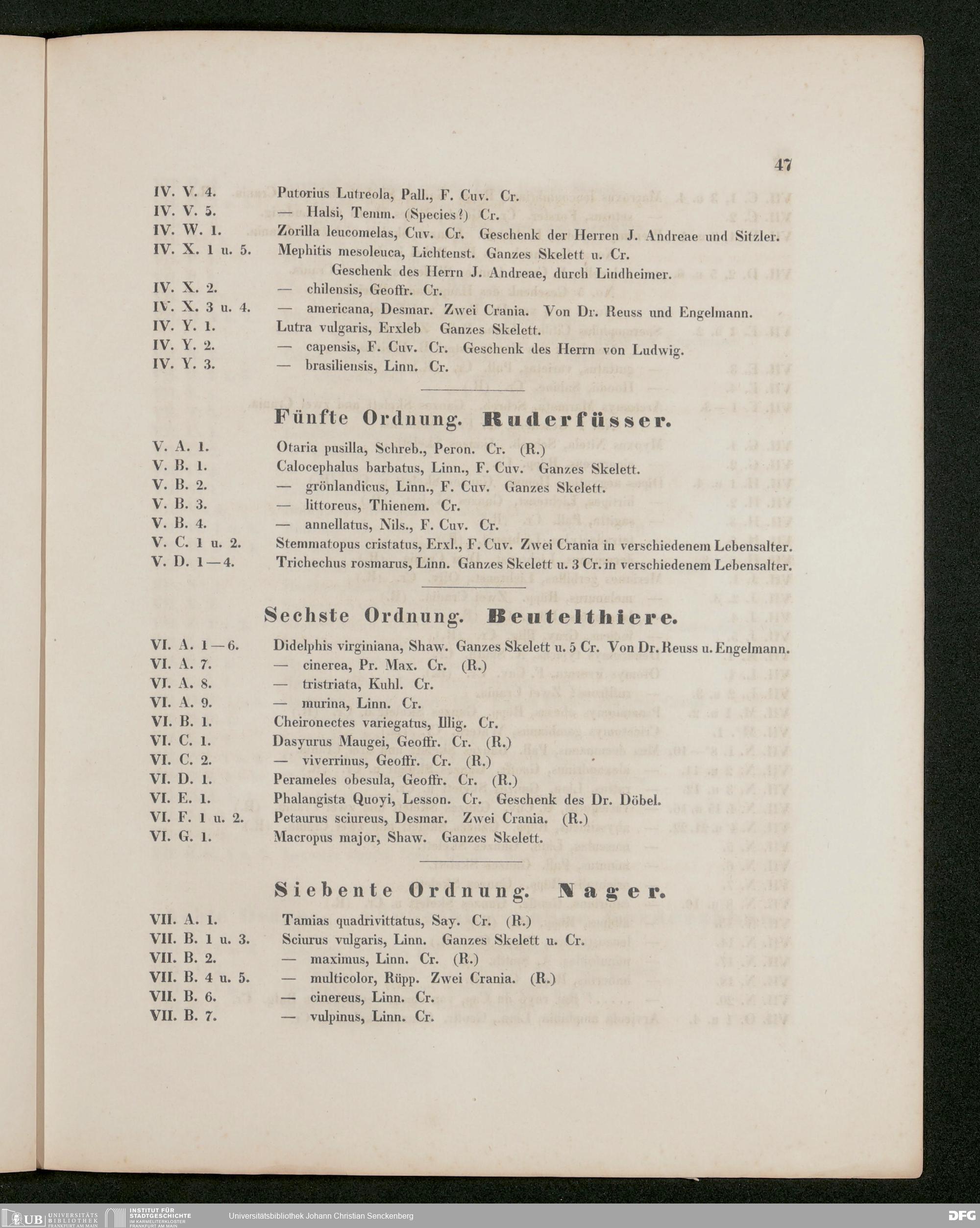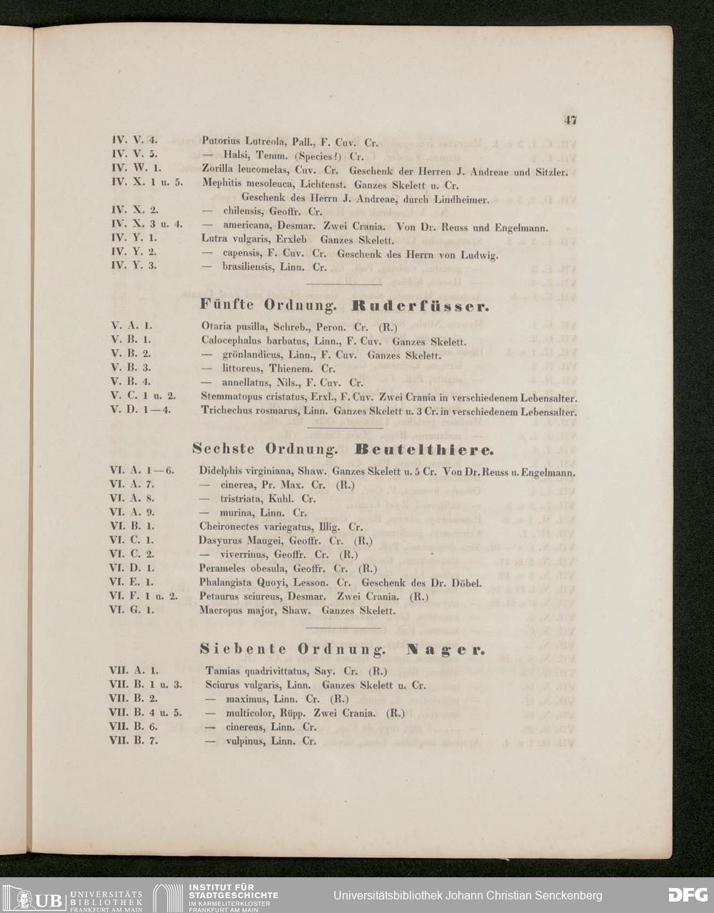 V176 Senckenberg Gesellschaft für Naturforschung, 486 - Eduard Rüppell, "Verzeichnis der in dem Museum der Senckenbergischen Naturforschenden Gesellschaft aufgestellten Sammlungen. Erste Abtheilung: Säugethiere und deren Skelette", Frankfurt a. M. 1842