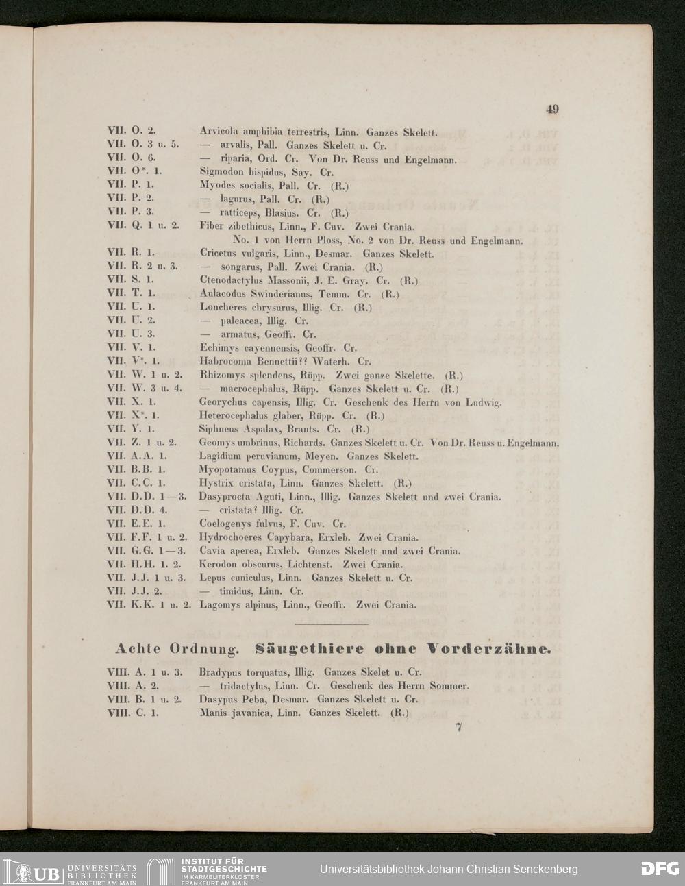 V176 Senckenberg Gesellschaft für Naturforschung, 486 - Eduard Rüppell, "Verzeichnis der in dem Museum der Senckenbergischen Naturforschenden Gesellschaft aufgestellten Sammlungen. Erste Abtheilung: Säugethiere und deren Skelette", Frankfurt a. M. 1842