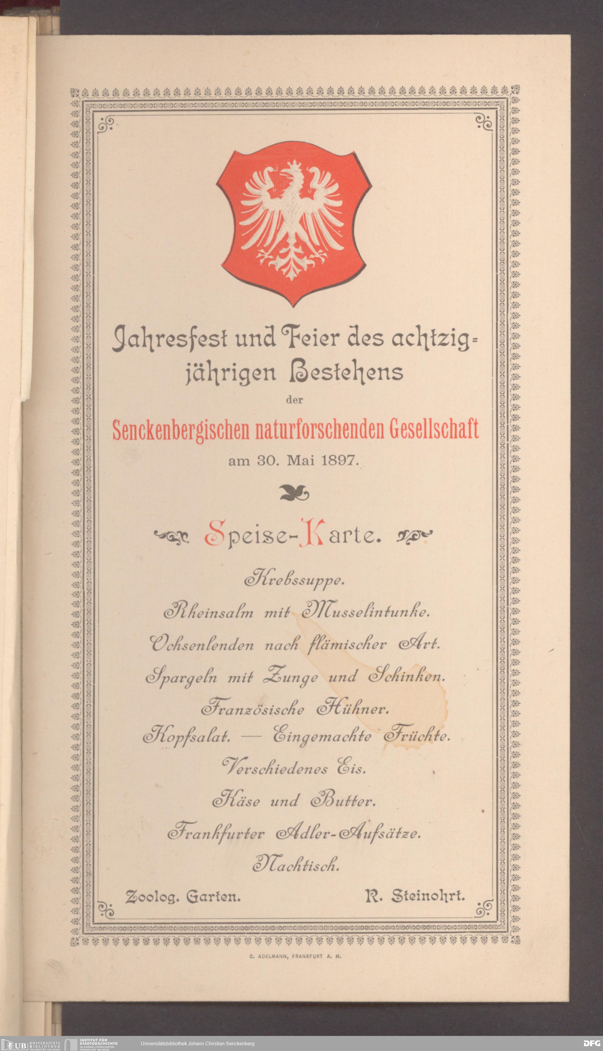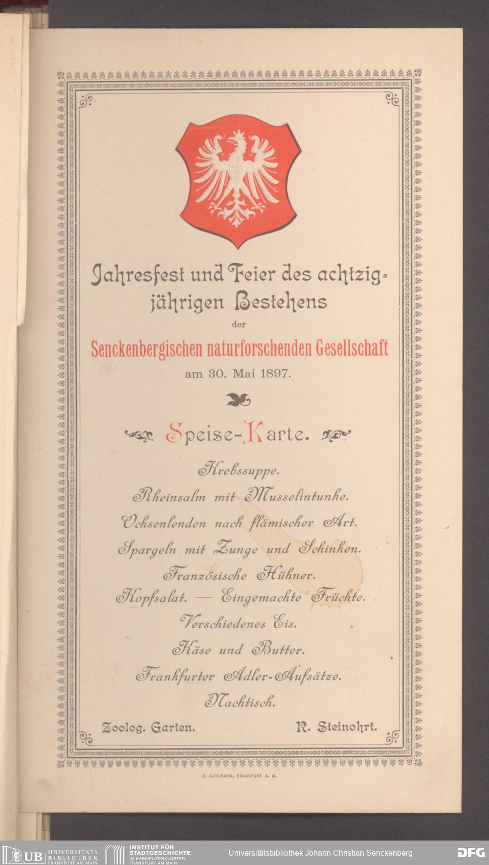 V176 Senckenberg Gesellschaft für Naturforschung, 497 - Eintrittskarten, Lieder- und Programmhefte sowie Speisekarten von Jahresfeiern, Doktorjubiläen und der Feier zur Eröffnung des Museums