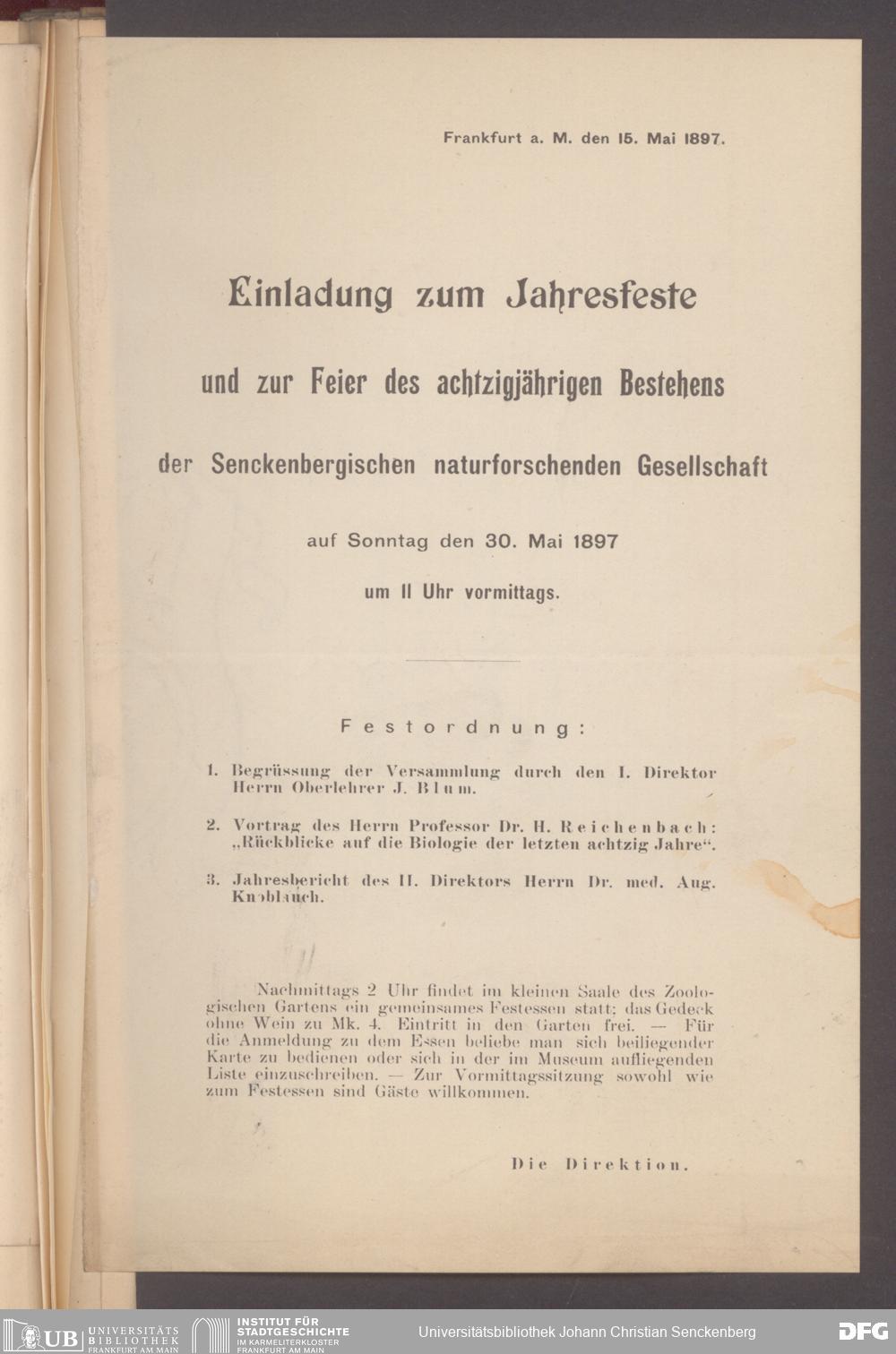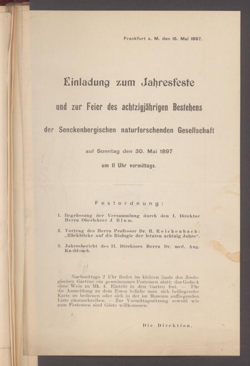 V176 Senckenberg Gesellschaft für Naturforschung, 497 - Eintrittskarten, Lieder- und Programmhefte sowie Speisekarten von Jahresfeiern, Doktorjubiläen und der Feier zur Eröffnung des Museums